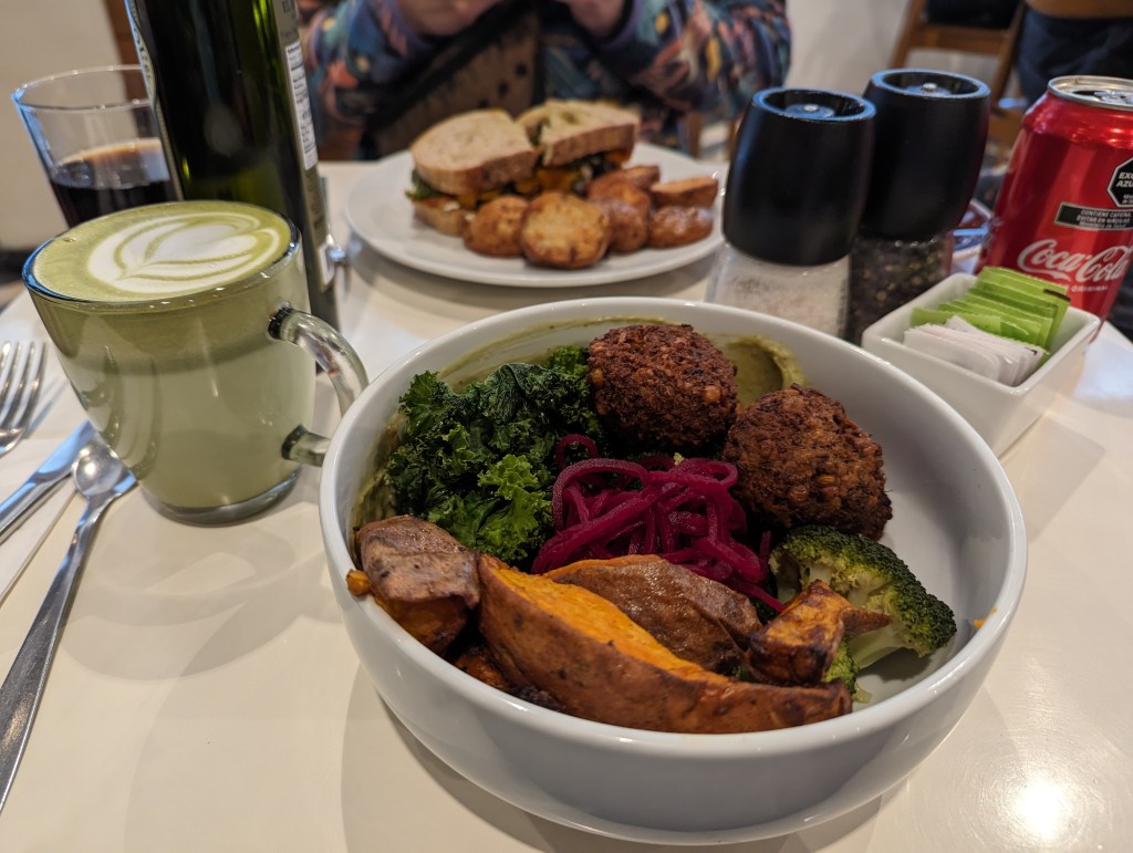 Am gestrigen Tag haben wir um 12 Uhr aus unserem Airbnb in Buenos Aires ausgecheckt. Danach waren wir im Café und haben einen Matcha Latte und Americano getrunken. Außerdem hatte Mira eine Art Smoothie, mit Limette, Zitrone und Minze – war sehr gut! Zu Essen gab’s für Fabi ein Sandwich mit Kürbis und für Mira eine Bowl mit Falafel und Süßkartoffel.