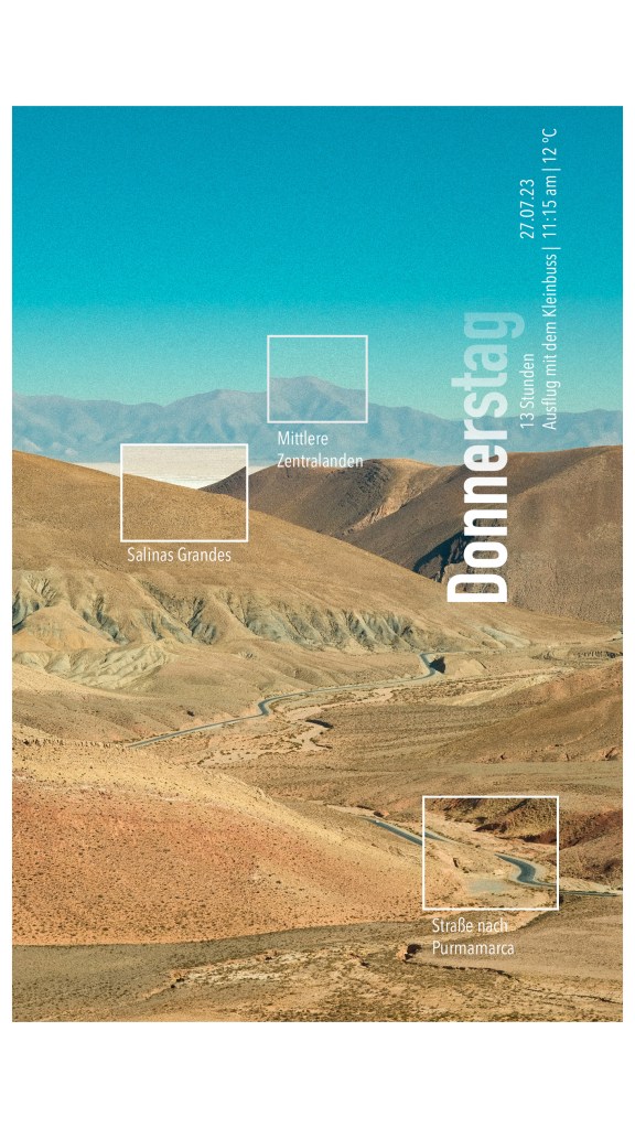 Nach einer atemberaubenden Fahrt, mit einem kurzen Stopp beim Berg der 7 Farben, haben wir um 11:30 Uhr die Salzwüste erreicht. Was für ein Anblick! Blauer Himmel und Salz, soweit das Auge reicht. Nach 40 Minuten musste es leider schon weitergehen. Toll war es trotzdem.
