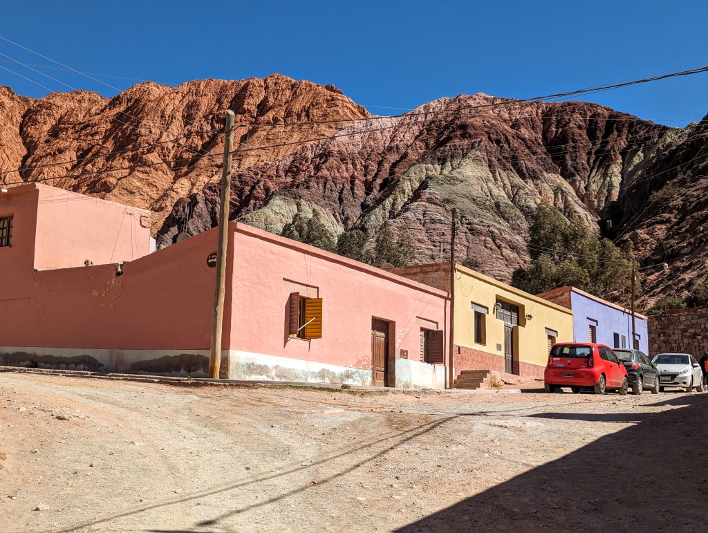 Die Fahrt hierhin war sehr lange, aber die Landschaft war beeindruckend schön. Bunte Berge und Kakteenlandschaften überall.