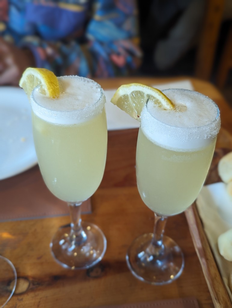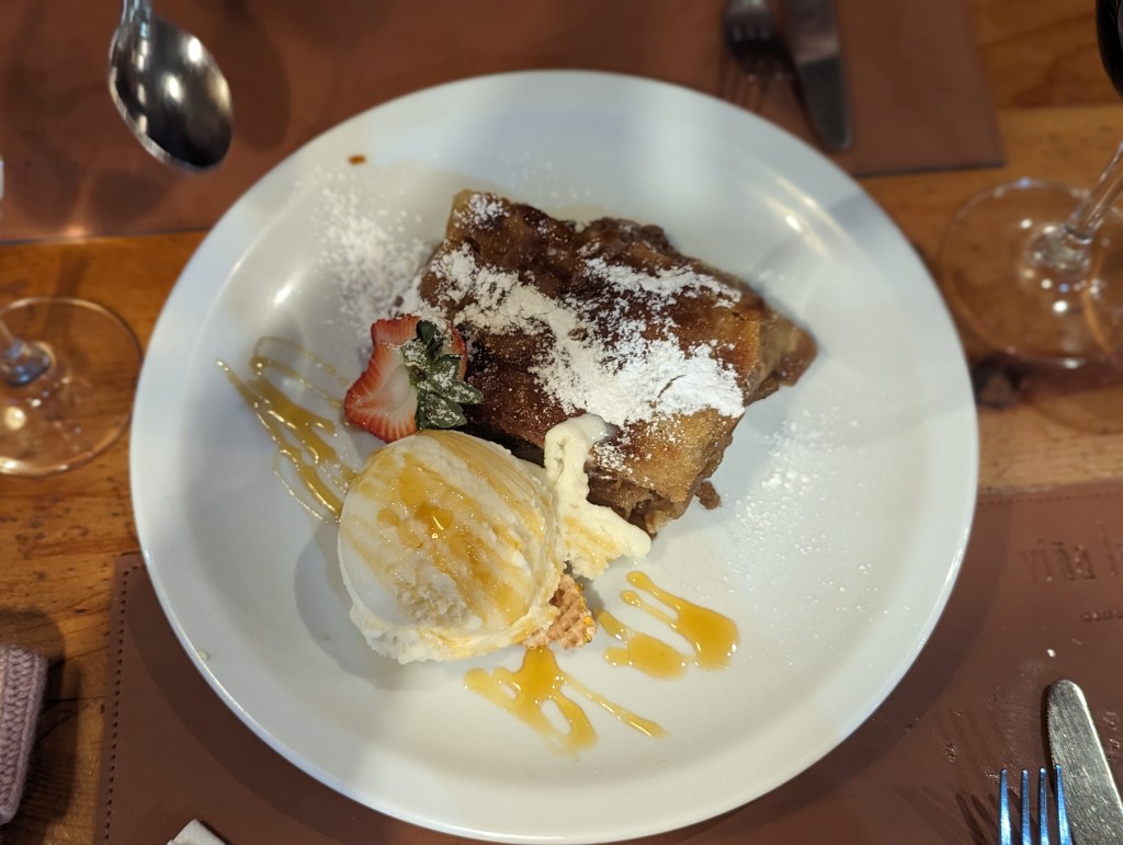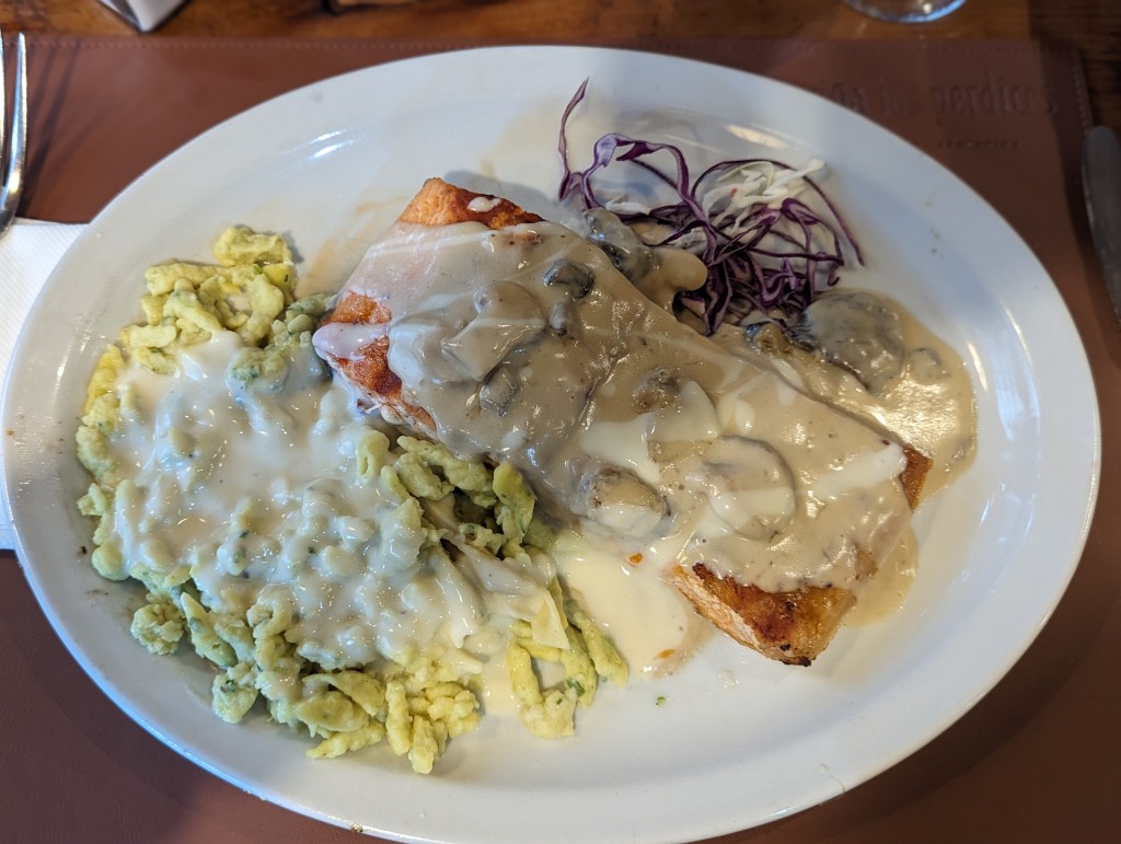 Wir trinken einen Pisco Sour und sehr guten Rotwein. Zu essen gibt’s Lachs mit Pilzrahmsoße und Spätzle. Lachs 7/10, Soße 5/10, Spätzle 3/10. Der Apfelstrudel zum Nachtisch mit Eis (gibt kein Vanille) war okay.