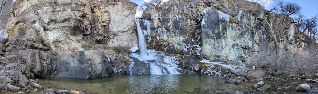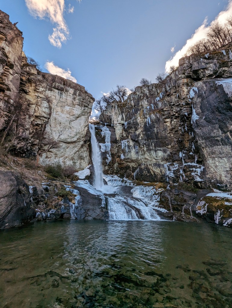 Angekommen, sehen wir einen schönen, vereisten Wasserfall. Wir genießen ein bisschen die Aussicht und laufen zurück.