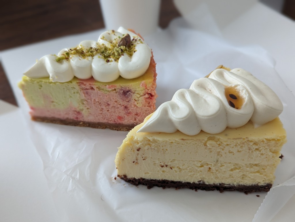 Wir haben uns morgens in der Nähe vom Bahnhof in einem Café zwei mächtige Stücke Cheesecake (Maracuja und Erdbeer/ Pistazie) geholt. Sehr gut und sehr sättigend.