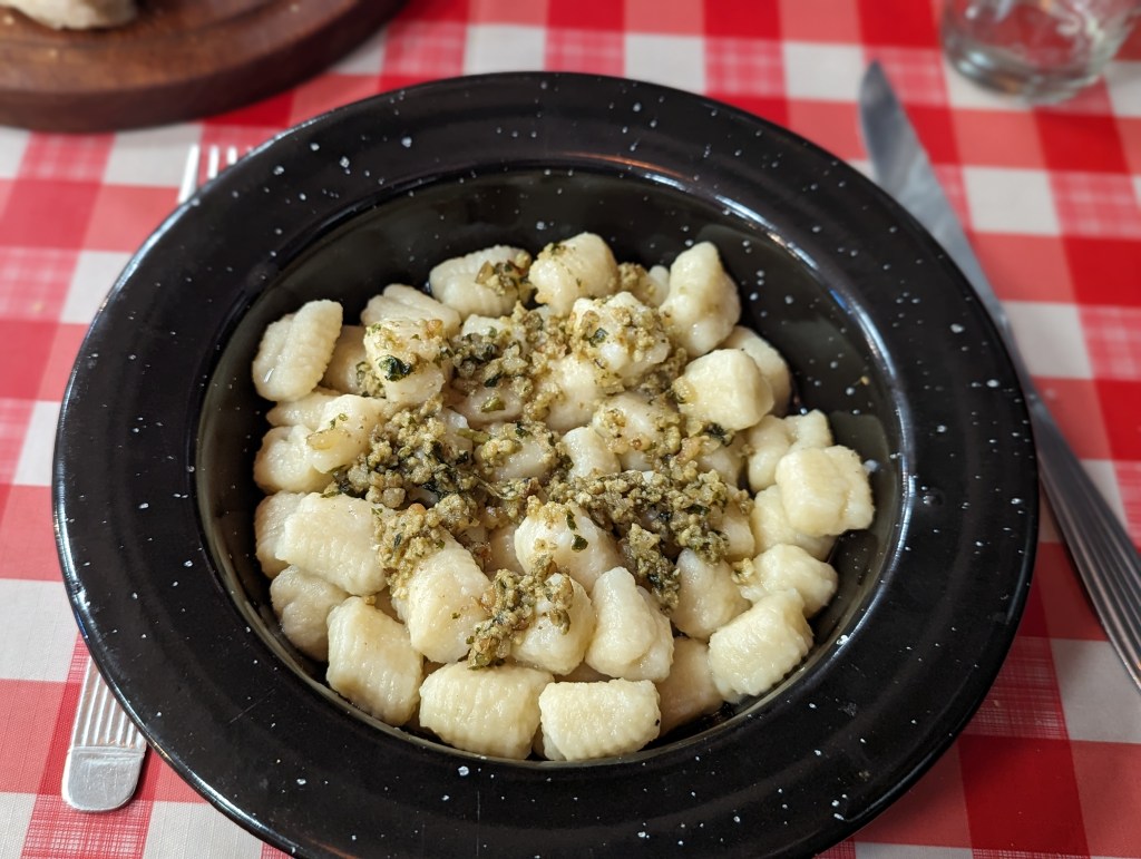 Fabi hatte Pizza Blue Cheese (wieder sooo käsig) und Mira Gnocchi Pesto Genovese. War gut, der Rotwein auch (8/10).