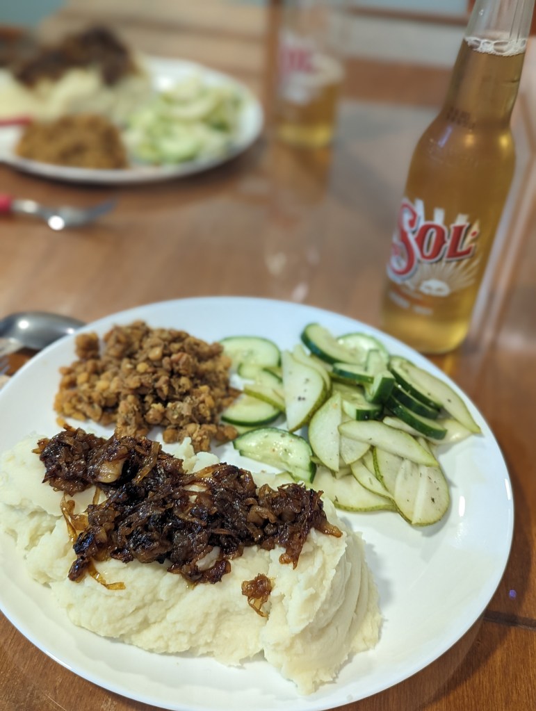 Wir waren dann noch einkaufen – Supermarkt ist gleich ums Eck. Zu Essen gab’s Kartoffelbrei mit karamellisierten Zwiebeln und Butterlinsen. Yam.
