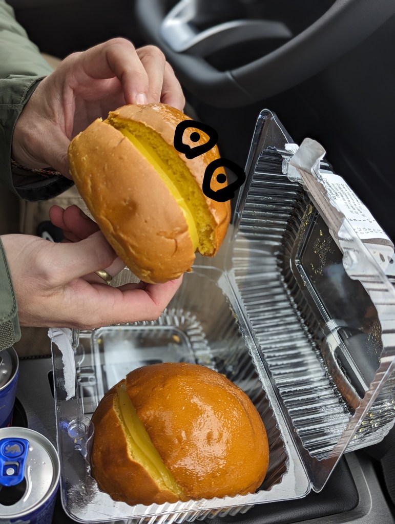 Wir machen auf etwas über der Hälfte des Rundweges Mittag. (Ca. 15 Uhr) Das Baguette, der Brie und Schmelzkäse sind gut und der Apfel passt gut dazu.