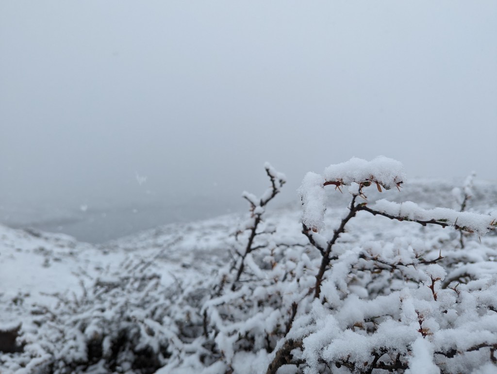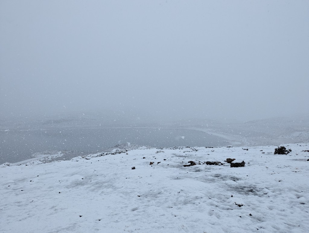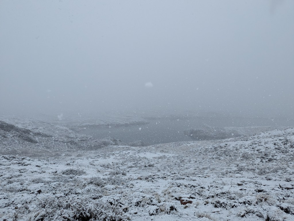 Auf einmal wird der Regen zu Schnee. Zu viel Schnee. Ab jetzt wird’s abenteuerlich, Aussicht immer noch 0. Schade, da die Panoramen sicher toll sind mitten in den Bergen. Aber wir können uns gut vorstellen, wie schön es ist.