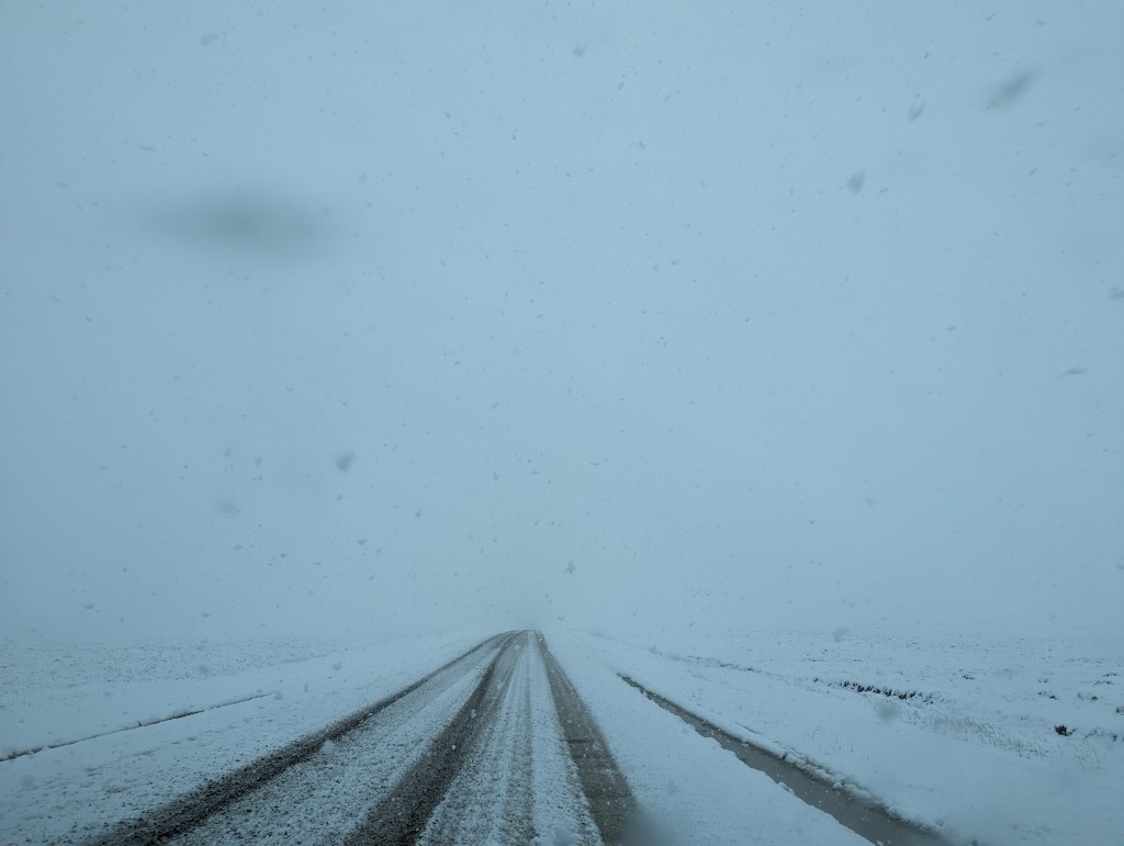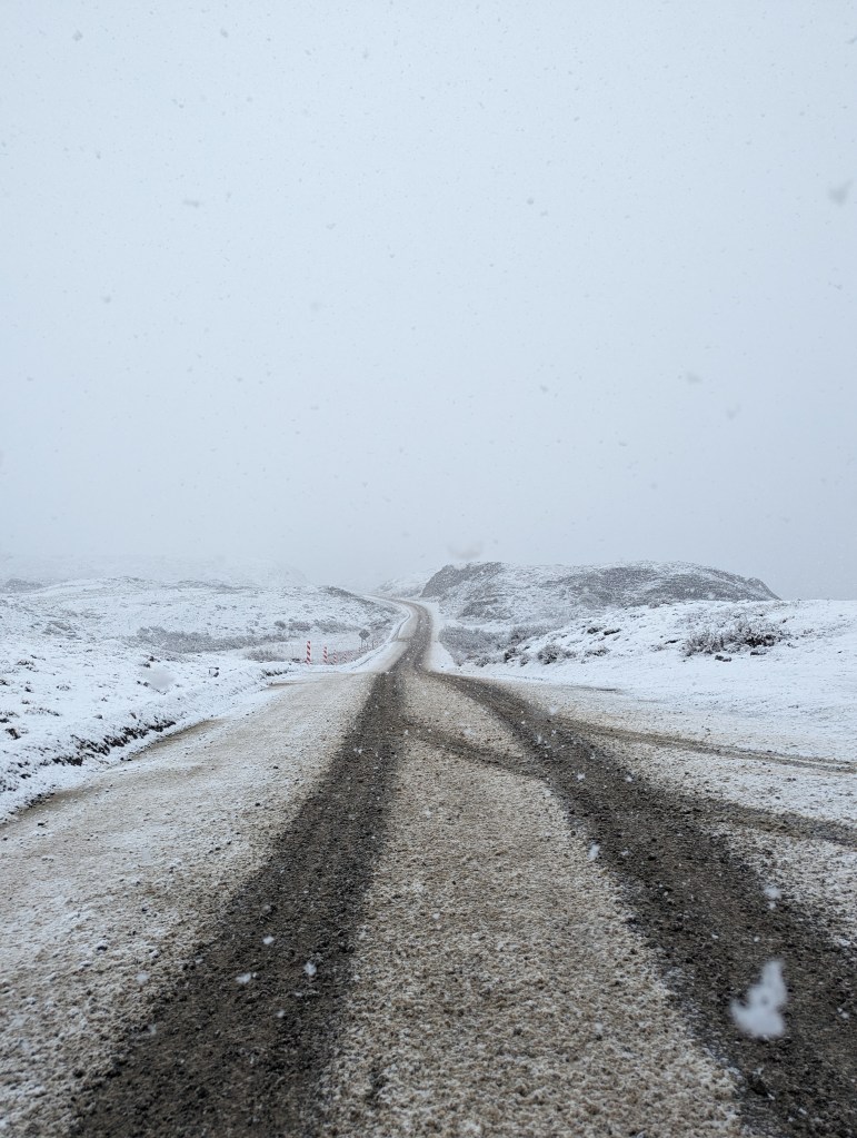 Der Rest des Weges ist… mutig (einfach gesagt). Gut, dass das Auto so schöne Allrad mit Spikes hat (Und ABS). Wir schlittern und bremsen an sicherlich atemberaubenden Panoramen vorbei.