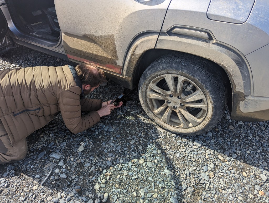 Einen Herzhüpfer später werden die Räder mit großen Steinen blockiert und der Wagenheber muss nochmal runter und hochgekurbelt werden.