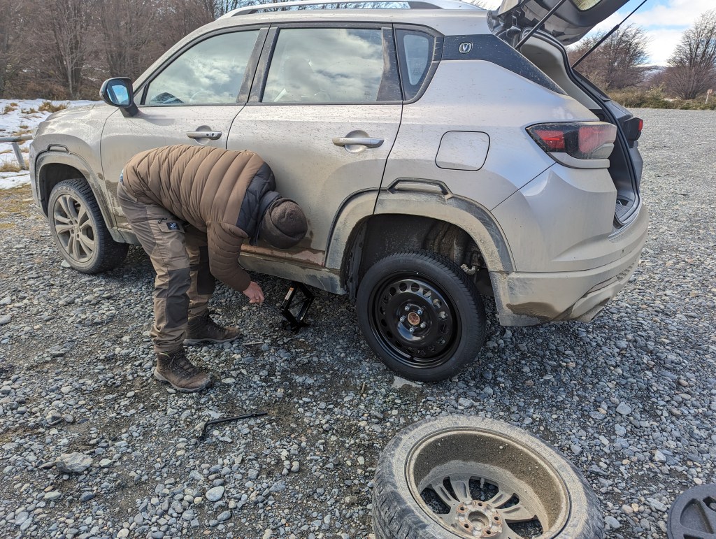Wir hören nun den Reifen zischen und in wenigen Minuten ist er platt. Zum Glück haben wir einen Ersatzreifen, aber wie wir dann feststellen, leider nur ein temporären, sehr Schmalen. Einen Wagenheber haben wir natürlich auch, einen zum kurbeln.