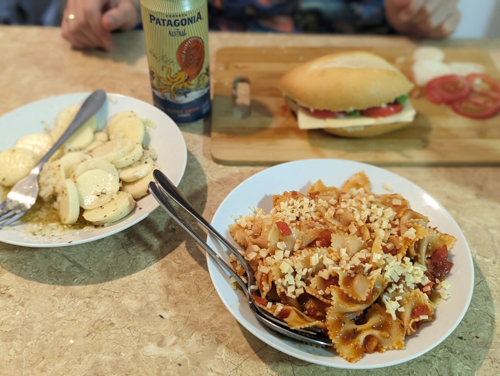 Zu essen gab’s die restlichen Nudeln von gestern und ein Sandwich mit Palmherzensalat.