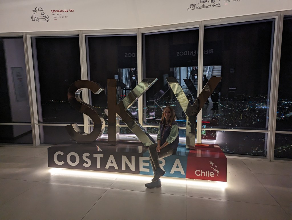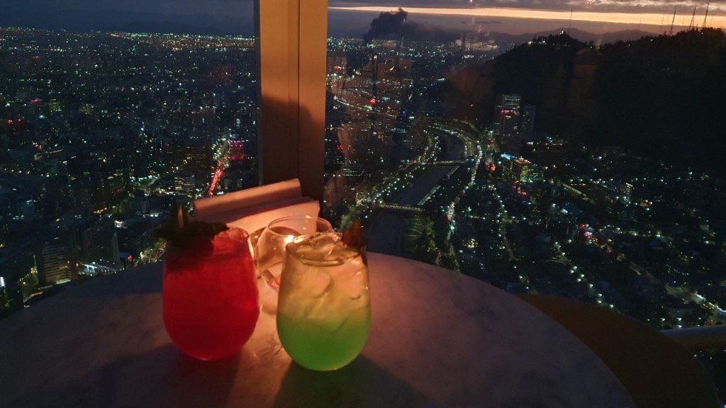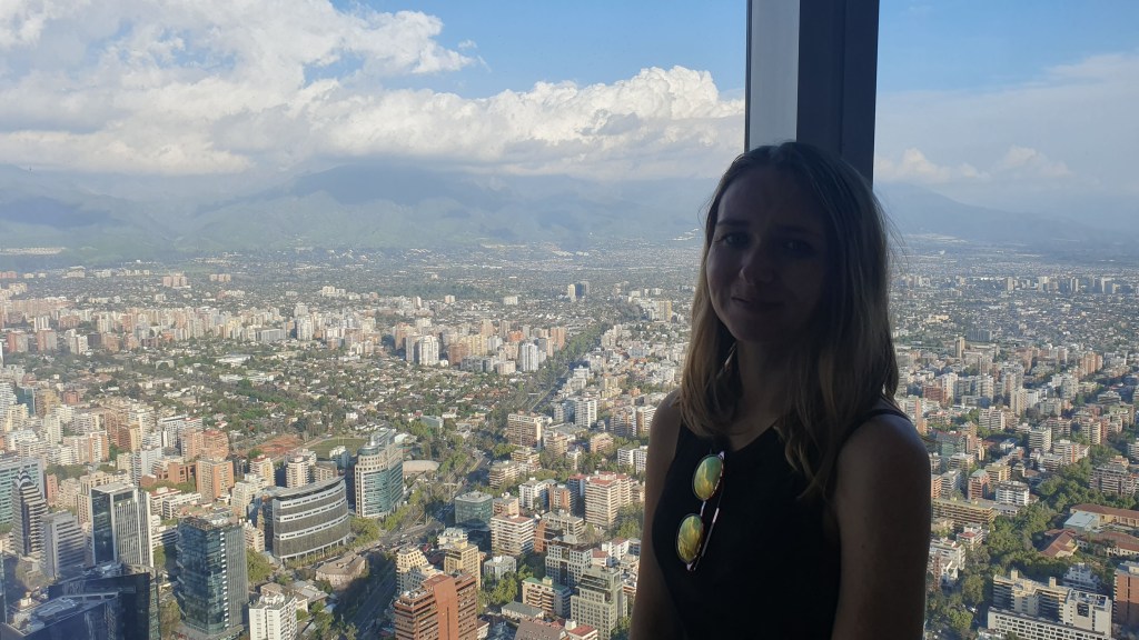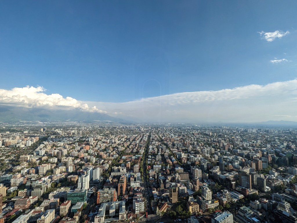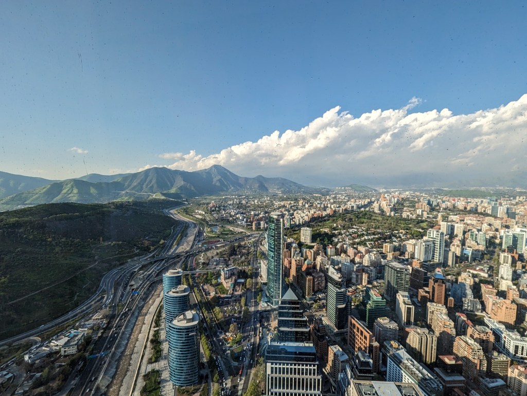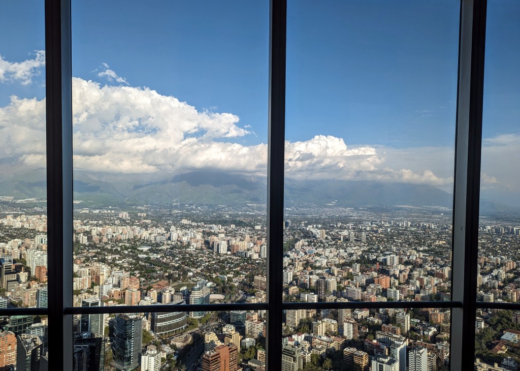 Mit dem Aufzug ging es nach oben in den 62 Stock. Hier hatten wir einen bombastischen Rundumblick auf Santiago. Die hohen Berge waren leider in Wolken, trotzdem toll.