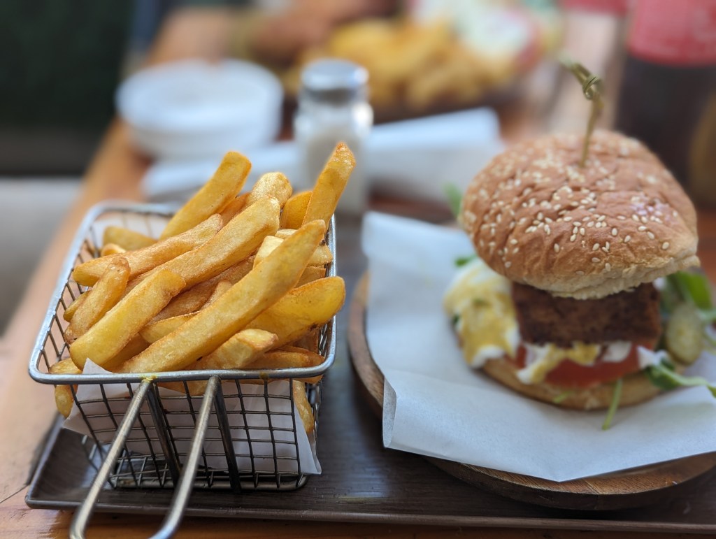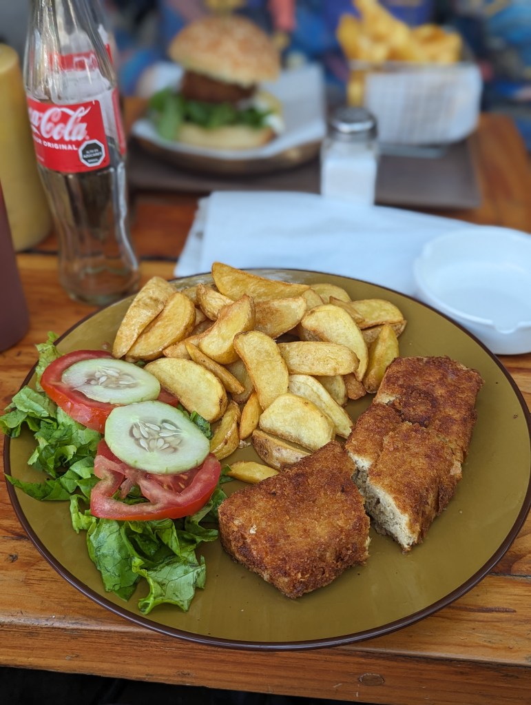 Auf dem Weg machten wir Halt bei einem Restaurant. Für Mira gab’s gebackenen Tofu, für Fabi einen Tofu Burger. War eher so Mittel, sehr viel altes Fett und das Brötchen war steinhart. Die Kartoffelecken waren gut.