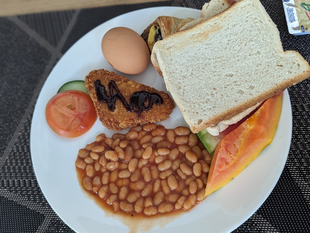 Wir haben ein bisschen Jetlag und sind ab 7 Uhr wach. Zum Frühstück gibt’s wieder Toast und Bohnen, aber auch gekochte Eier und Hashbrowns. Auch ganz lecker.