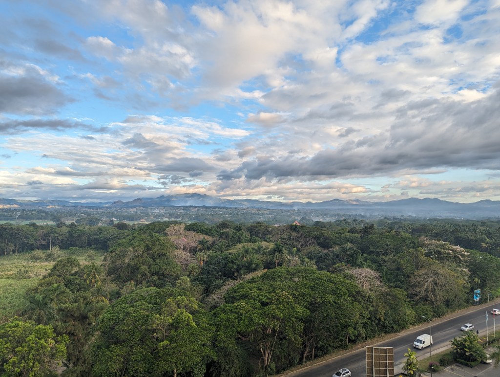 Mira jetlagt um 21:30 Uhr ins Bettchen, Fabi ein bisschen später. Der Sonnenuntergang oben am Dach war toll.