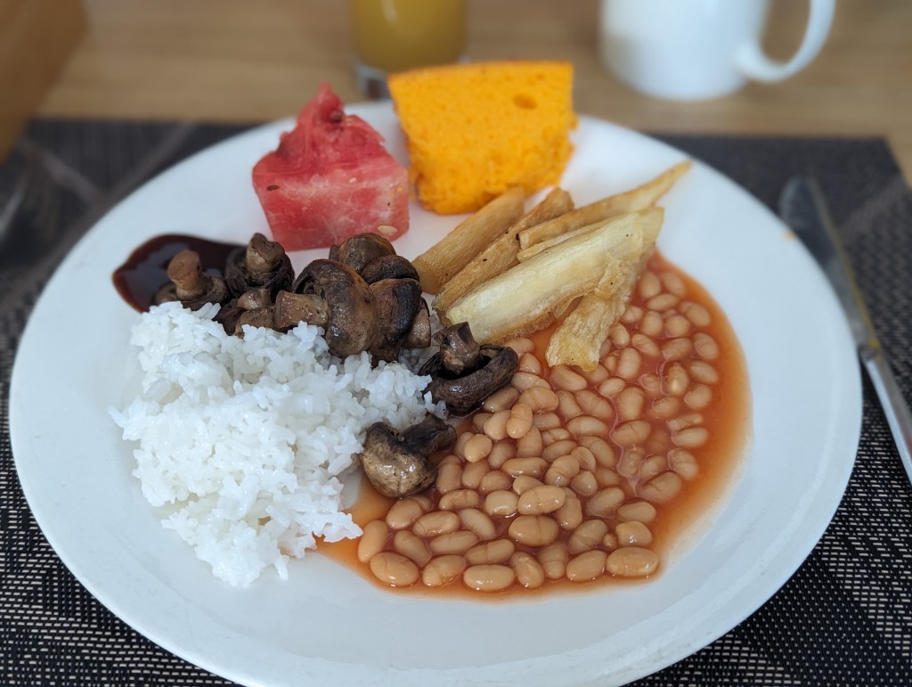 Morgens gingen wir wieder üppig frühstücken. Es gab gebratene Champignons, Bohnen, irgendein Wurzelgemüse, usw.