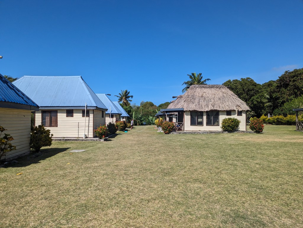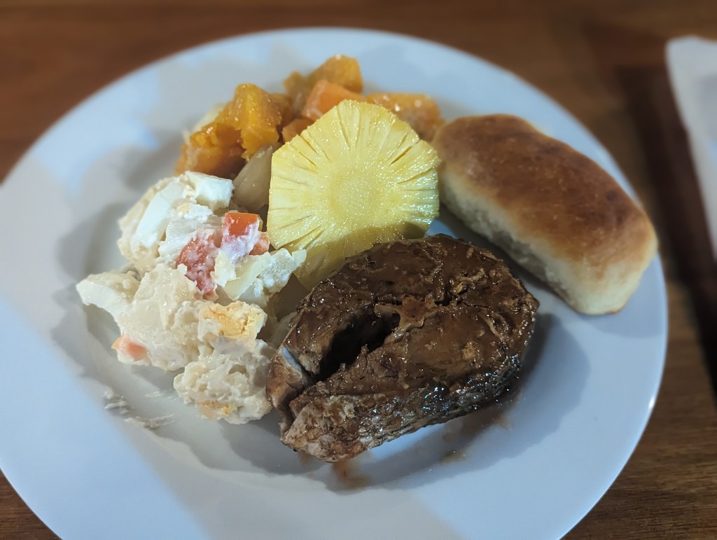 Zum Abendessen gab es dann noch mal sehr guten Fisch und Kartoffelsalat. Da das Resort heute sehr leer war, saßen alle an einem Tisch.