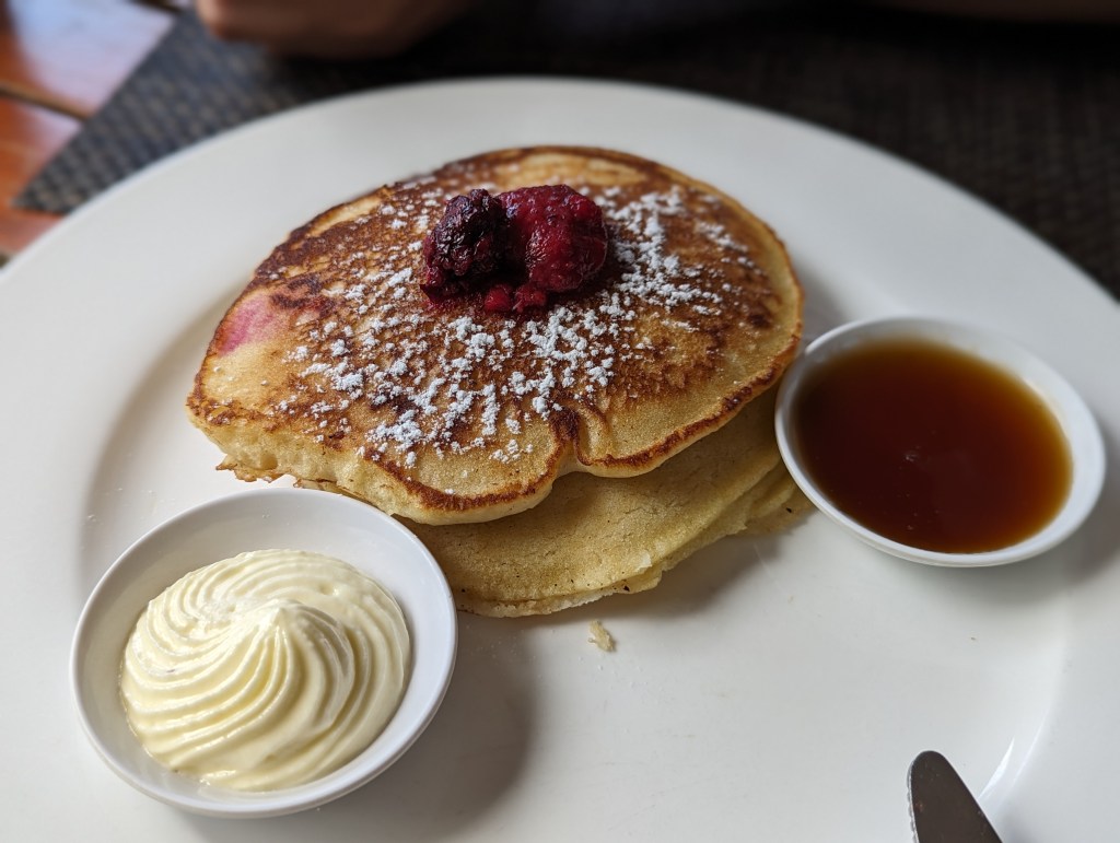 Morgens gab es ein entspannt spätes Frühstück mit Pancakes und Ahornsirup. War okay.