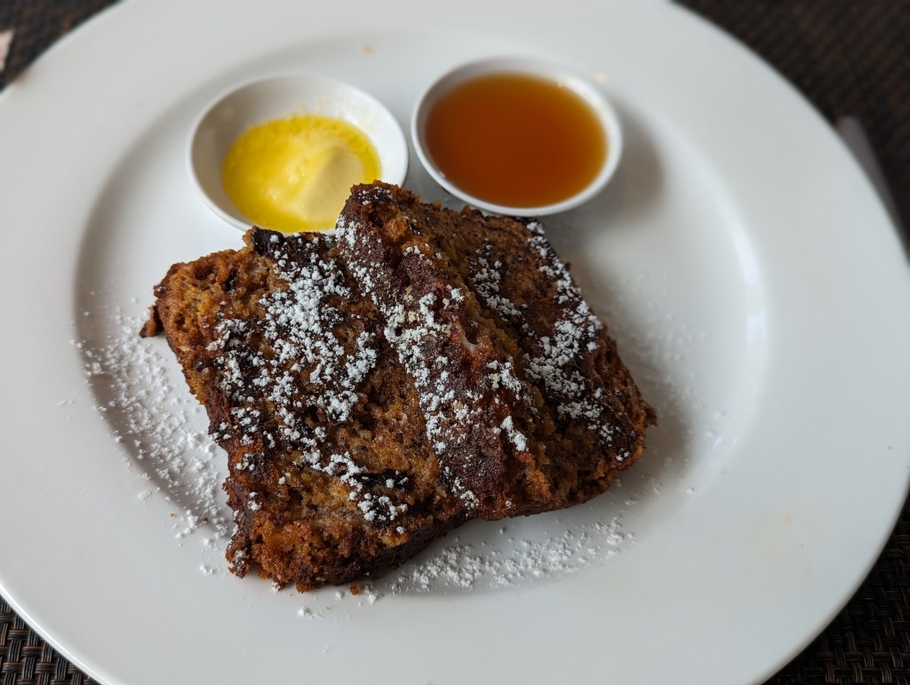 Fabi isst Frühstück für zwei: Egg Benedict und French Toast aus Bananenbrot. Wer erstaunlich lecker.