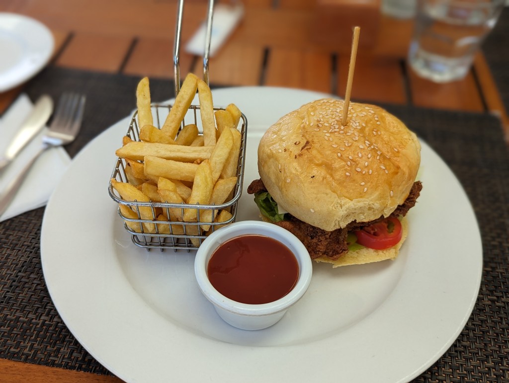 Nach Begrüßungstrunk gibt’s wieder Chicken, ääh Fischburger für Fabi, Mira pausiert.