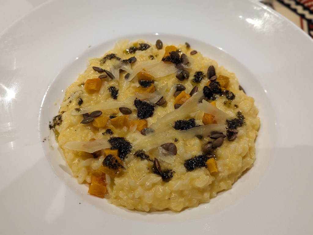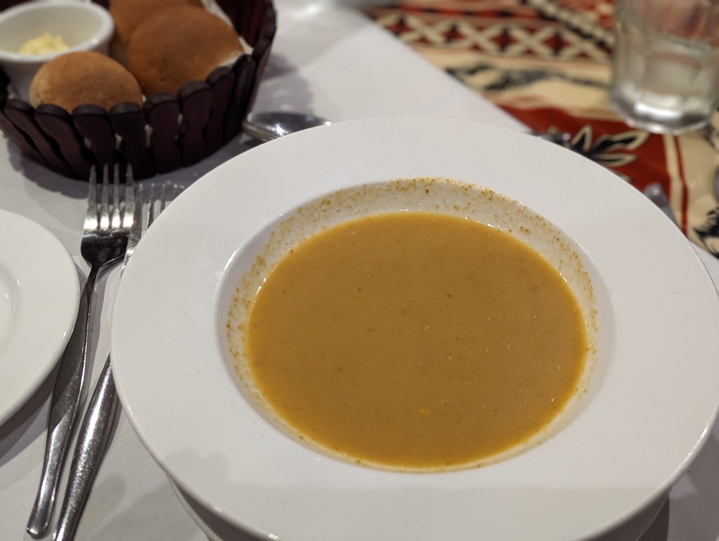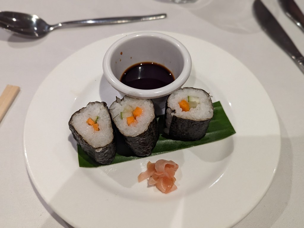 Vorspeisen sind Suppe und Veggie Sushi. Die Suppe war ganz gut, irgendwas mit geröstetem Gemüse.