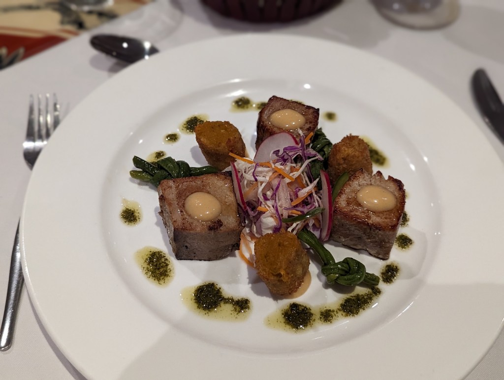 Abends hat Fabi genau das gleiche Hauptgericht wie am Vortag im anderen Resort. Schmeckt hier aber deutlich schlechter.