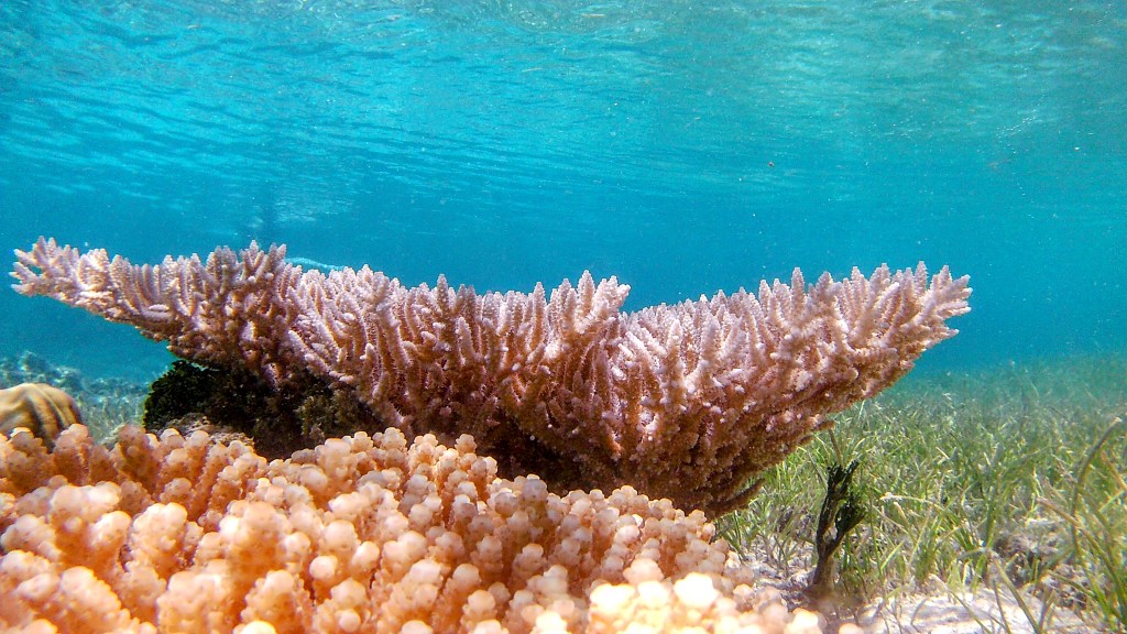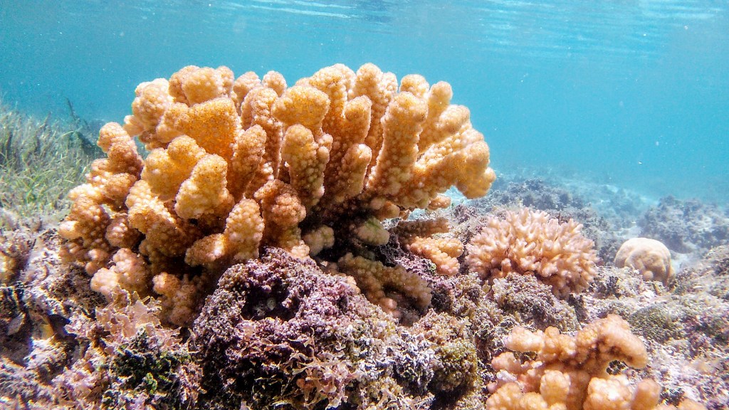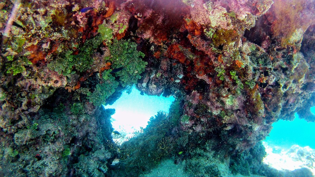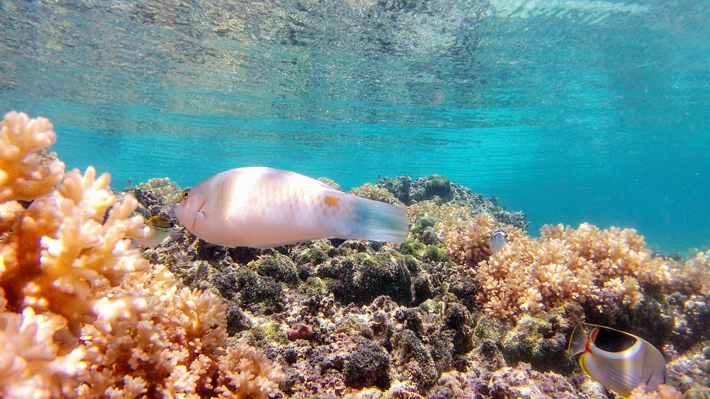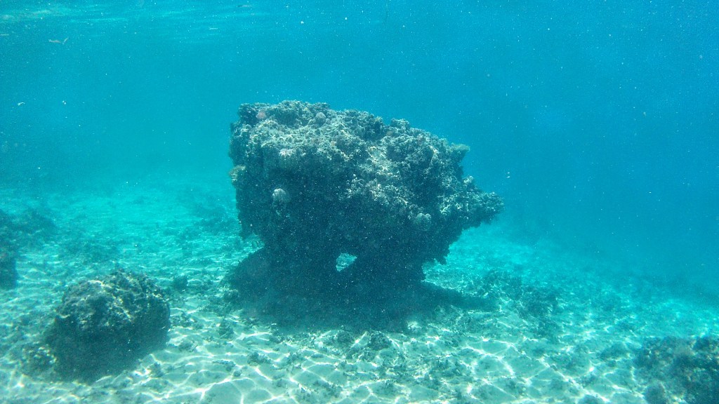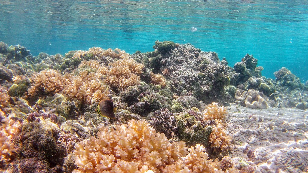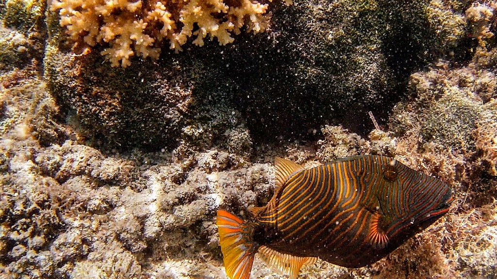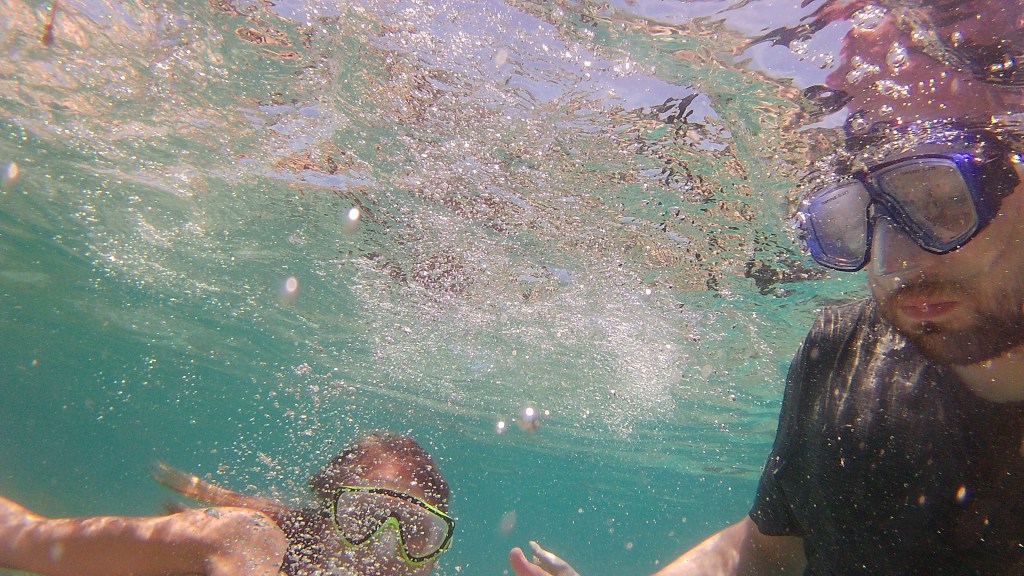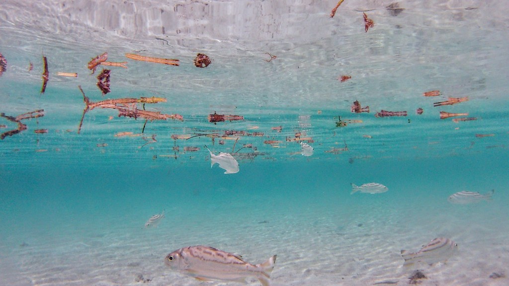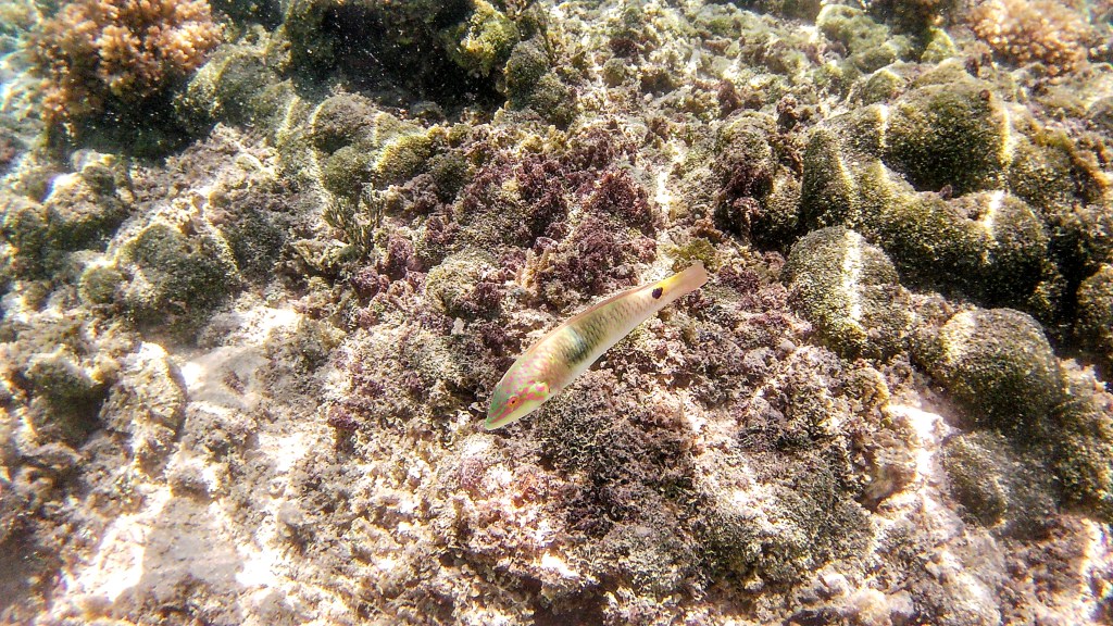 Schnorchel und Flossen haben wir nicht dabei, aber immerhin die Taucherbrillen. So viel zu „um die ganze Insel gibt es nichts zu sehen“. Naja, doch, hier schon, nicht besonders üppig, doch wir sehen einige Korallen und bunte Fische.