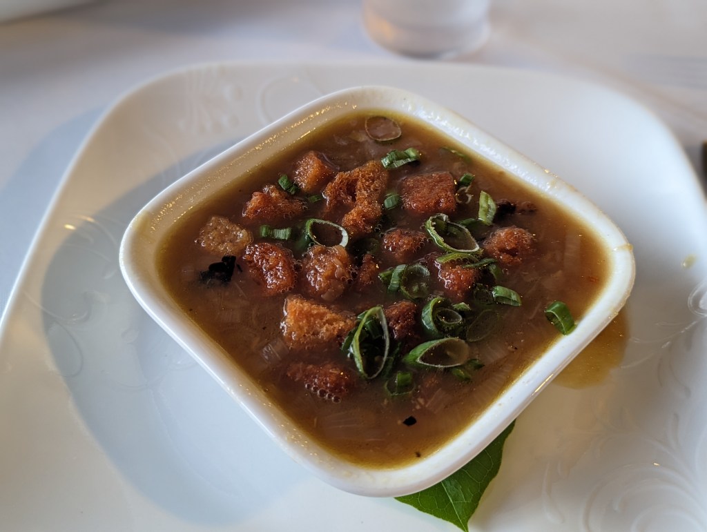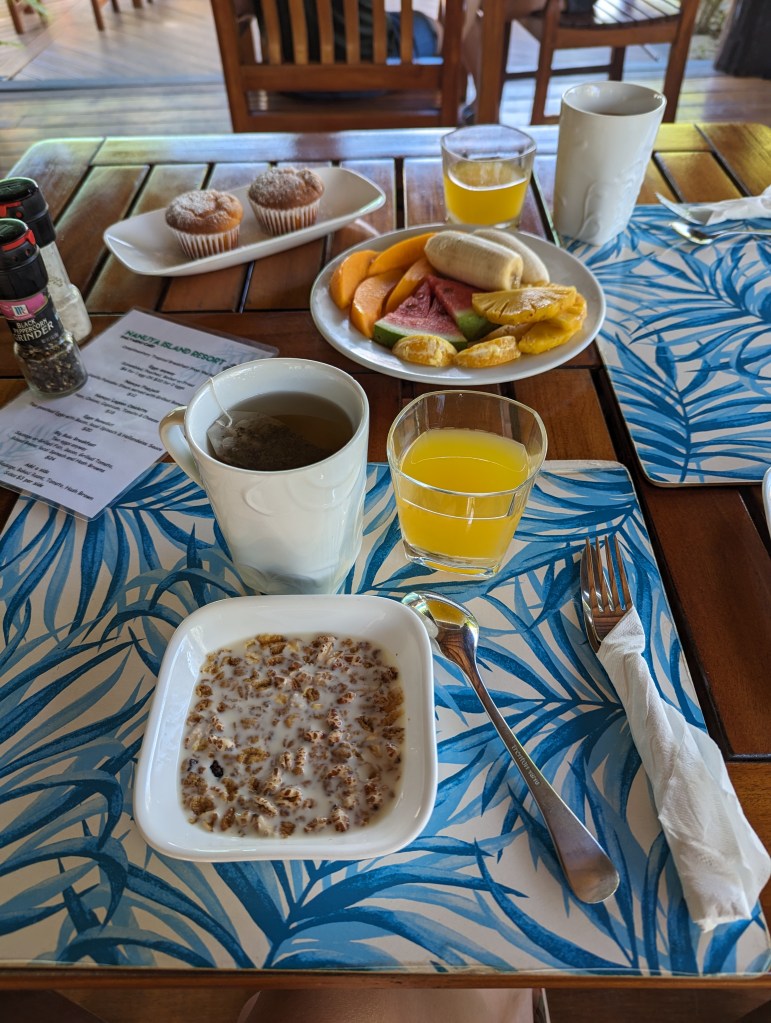 Abends trinken wir einen Piña Colada und eine „Smooth Lady“, zum Essen gibt’s zur Vorspeise Zwiebelsuppe (bestimmte vegetarisch 🙃) und zur Hauptspeise Fischcurry.