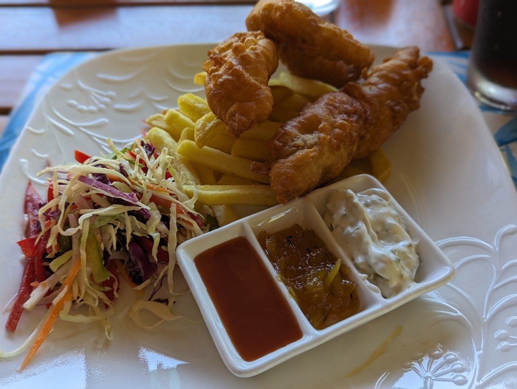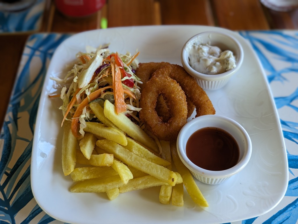 Nach ausgiebiger Taucherei machen wir uns auf den Rückweg. Zum Mittagessen gibt’s heute nichts vegetarisches, Mira kriegt Fish & Chips und Fabi Calamari.