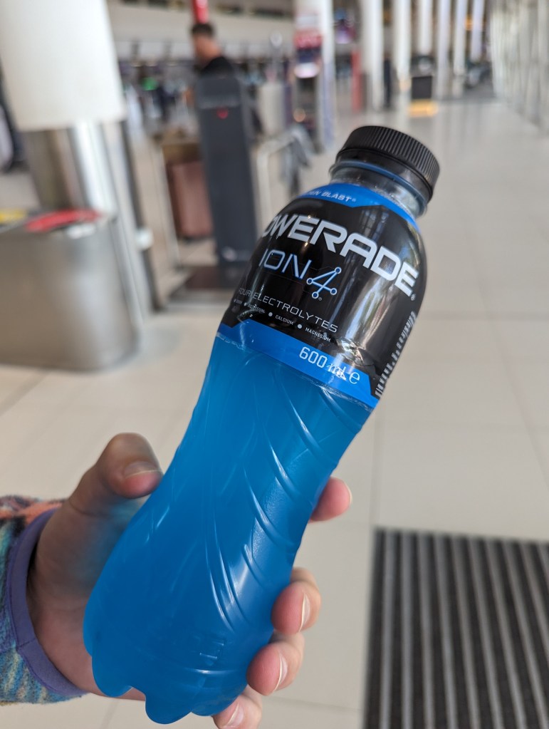 Am Flughafen holt sich Fabi noch eine SIM-Karte und wir kaufen uns nach vielen, vielen Jahren unser erstes Powerade. Überall auf unserer Weltreise trinken die Menschen das.