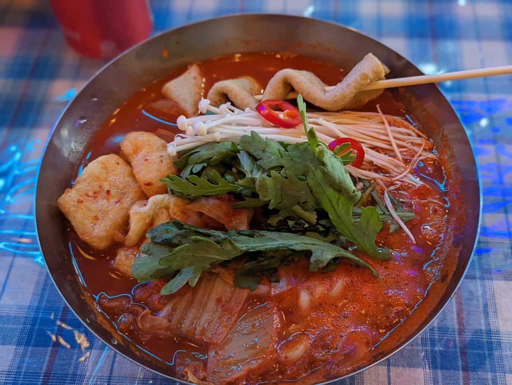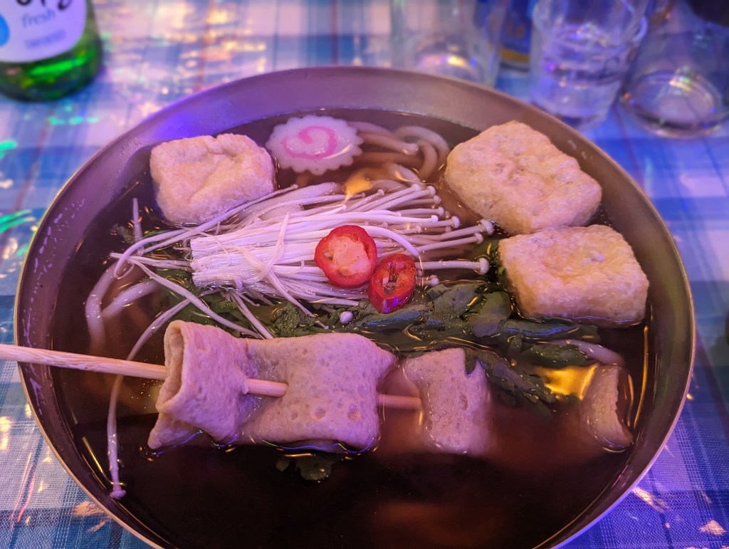 Wir kaufen uns E-Zigaretten und gehen danach koreanisch Essen. Fabi hat Udon Kimchi und Mira Udon Korean style + Somek (Can-Bier gemischt mit Soju )