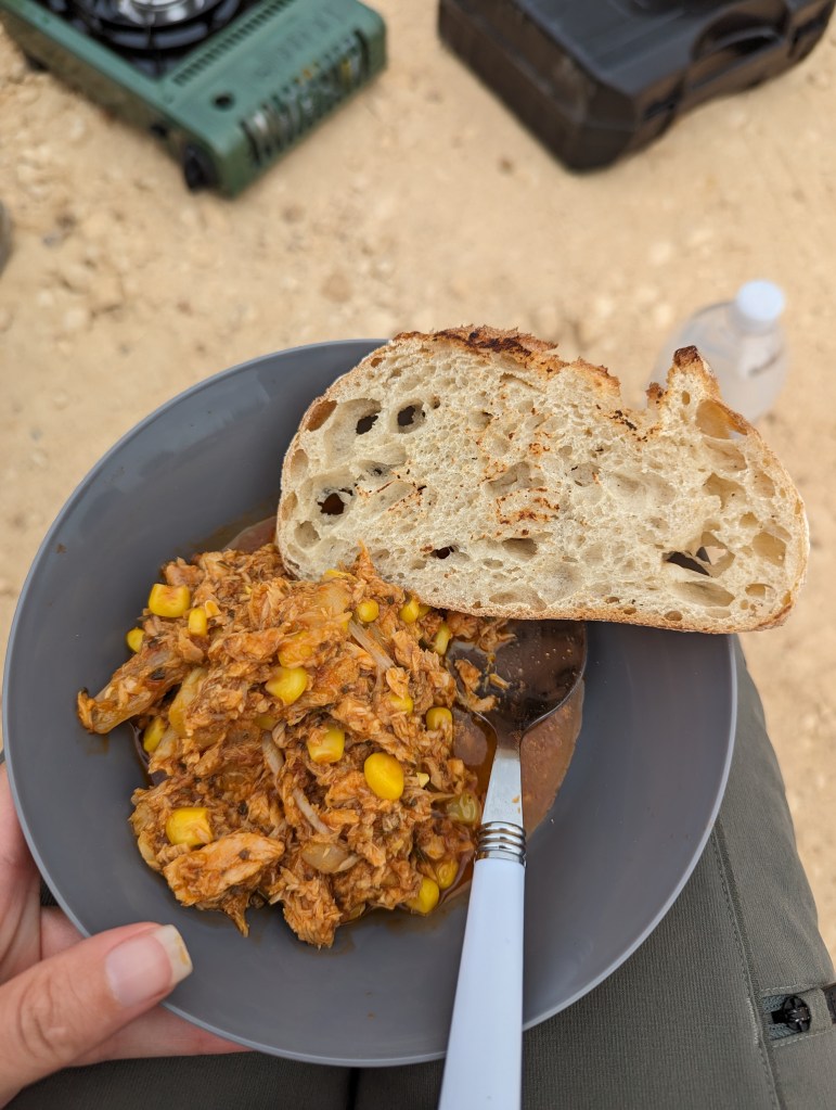 Fabi kocht Kaffee und Tee. Noch ist die Temperatur angenehm kühl. Gegen 8 gibt’s Frühstück, Thunfischsalat mit Mais und Spargel.