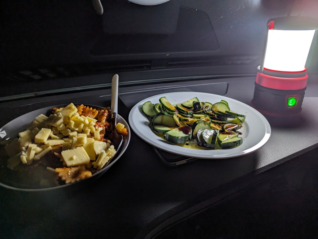 Abends gibt’s nach einer Chilleinheit im Auto Nudeln mit Tomatensoße und Gurkensalat. Fabi hat zu spät gekocht und musste im Dunkeln fertig kochen. Das macht Spass!