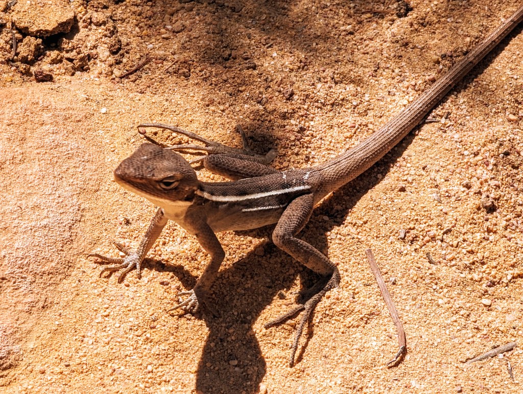 Auf dem Weg begegnen wir einer Langnasenagame.