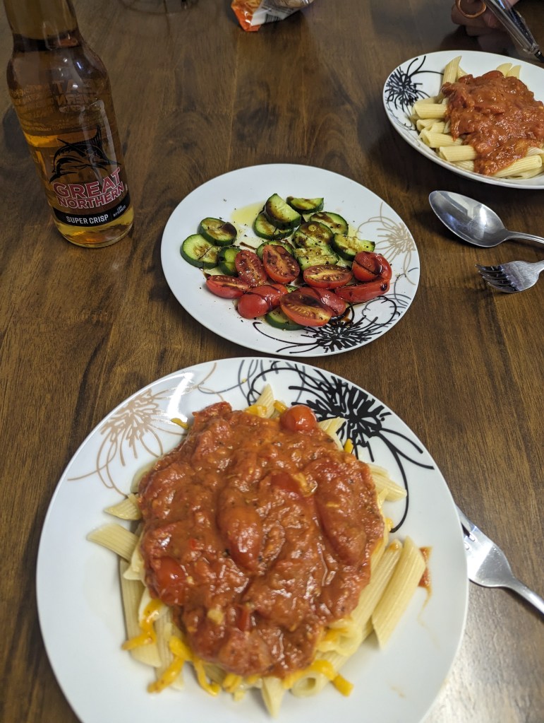 Zu Essen gibt’s Nudeln mit Tomatensoße.