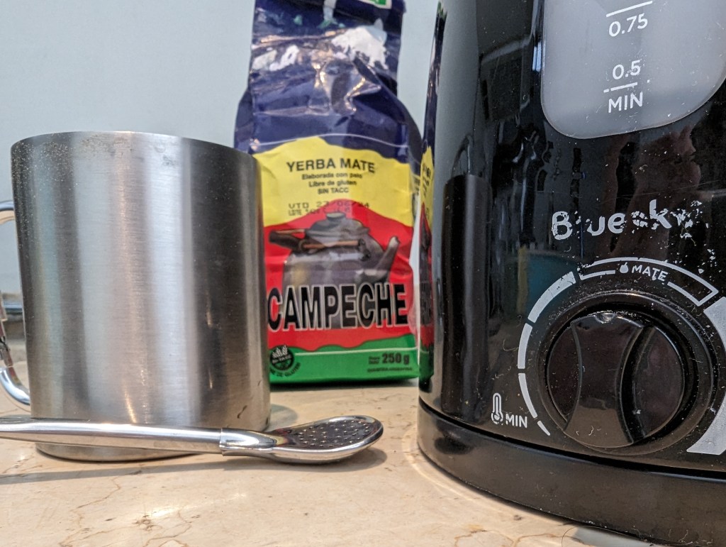 Da wir immer gerne Mate-Eistees getrunken haben und Mira ab und an auch normalen Mate-Tee, konnten wir nicht anders und haben uns auch einen Strohhalm und Tee gekauft. Mit ein bisschen Übung schmeckte der Tee uns auch recht gut. Sehr kräuterig, ein bisschen herb und bitter. Mira mag Grün- und Schwarztee trotzdem lieber und Fabi Kaffee.