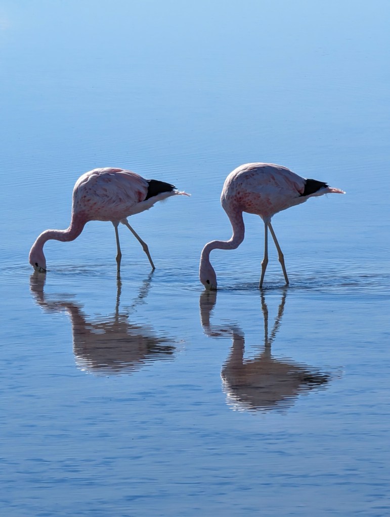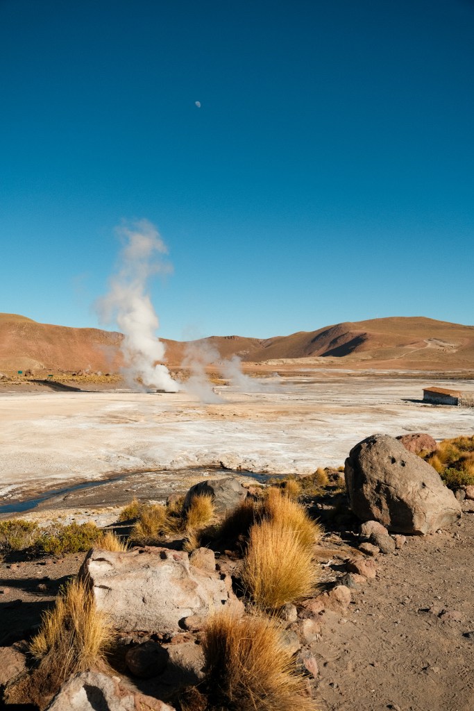 Die Oase liegt in der trockensten Wüste der Welt – Atacama. Tagsüber war die Sonne sehr heiß, nachts froren wir mit 5 Decken im Bett. Mit dem Auto fuhren wir ins Mars / Death Valley. Früh mussten wir an einem Tag raus um zu den 4.320 m hohen Geysiren del Tatio zu fahren. Das höchste und drittgrößte Geysirfeld der Erde. Wir liefen auch ein paar Wanderwege durch die Wüste im Valle de la Luna und konnten Flamingos in der Laguna Chaxa beobachten. Außerdem hatten wir jede Nacht einen beeindruckenden Sternenhimmel.