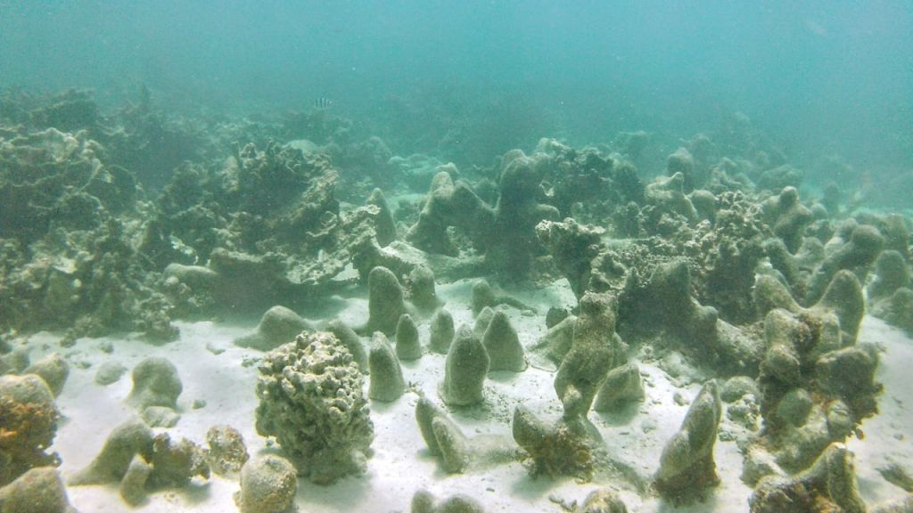 Nun – das war mal. Da wo wir sind ist kein buntes Riff mehr vorhanden. Laut Internet war letztes Jahr ein Großteil von der Korallenbleiche betroffen. Auch Fische gibt es kaum.