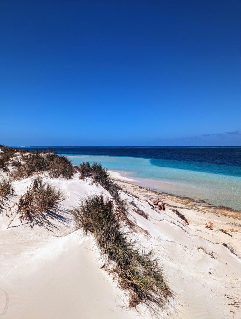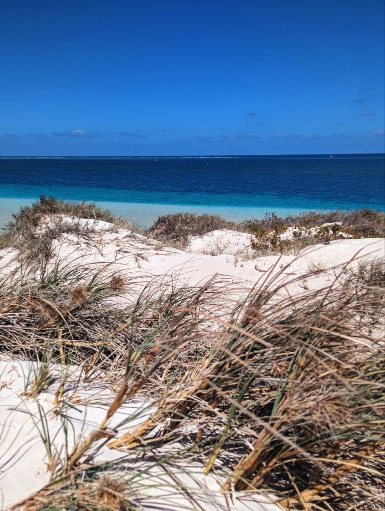 Ein traumhaft schöner Strand liegt vor uns, wir laufen eine Sanddüne hinauf und genießen die schöne Aussicht.