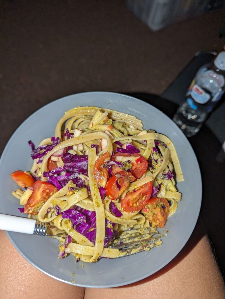 Wir essen Nudeln mit Pesto, dann drehen wir noch mal ordentlich die Klimaanlage auf und versuchen zu schlafen.