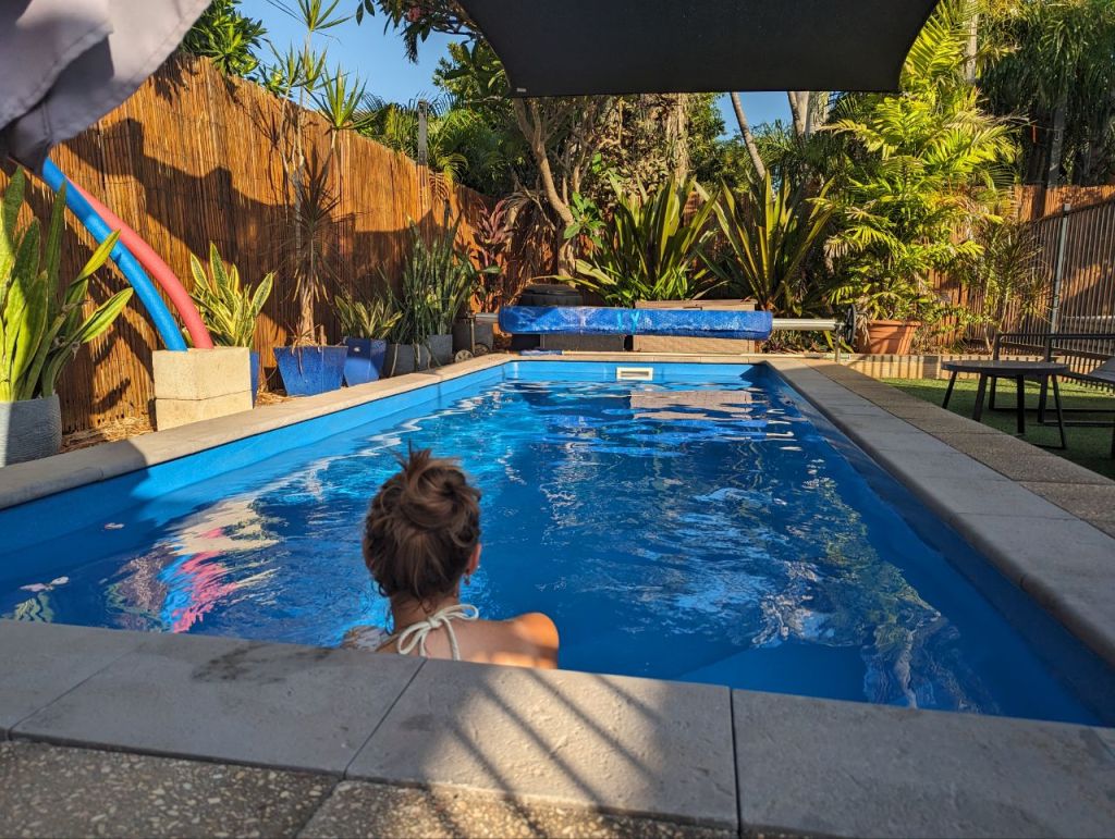Danach fahren wir zurück und Mira genießt unseren Pool.