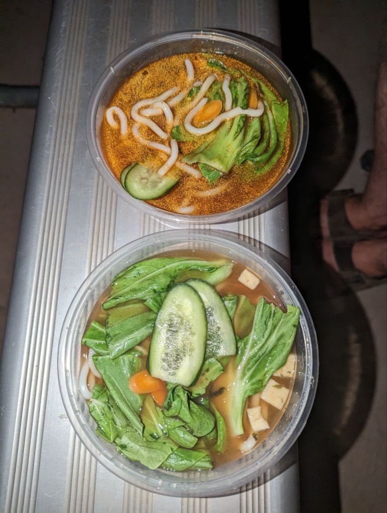 Zum Essen machen wir uns erstaunlich gute Fertigsuppen, Fabi hat Kimchi, Mira Miso.