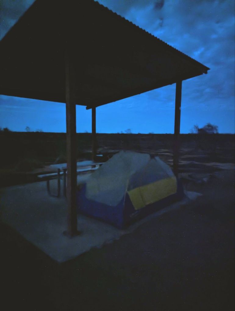 Wir setzen uns noch mal ins Auto und kühlen uns ab. Dann bauen wir das Zelt auf, aber nur den inneren Teil.