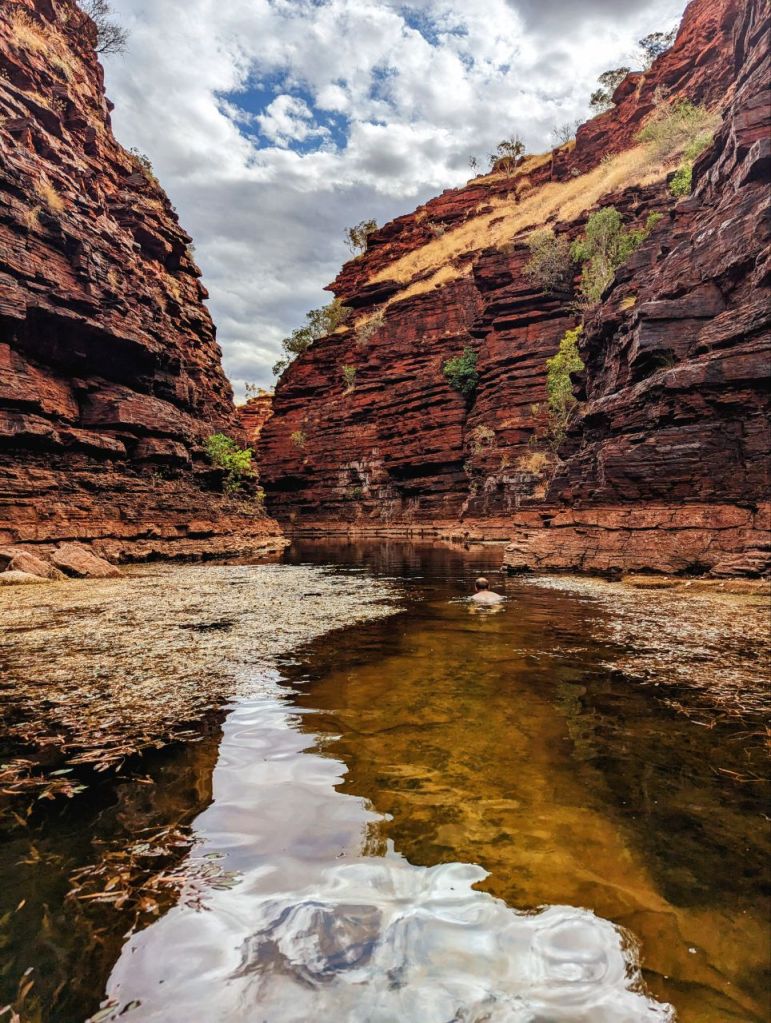 Ca. 400 Meter schwimmen wir durch den Canyon zur Insel. Fabi macht das schwarze Wasser gar nicht soo viel Spaß.