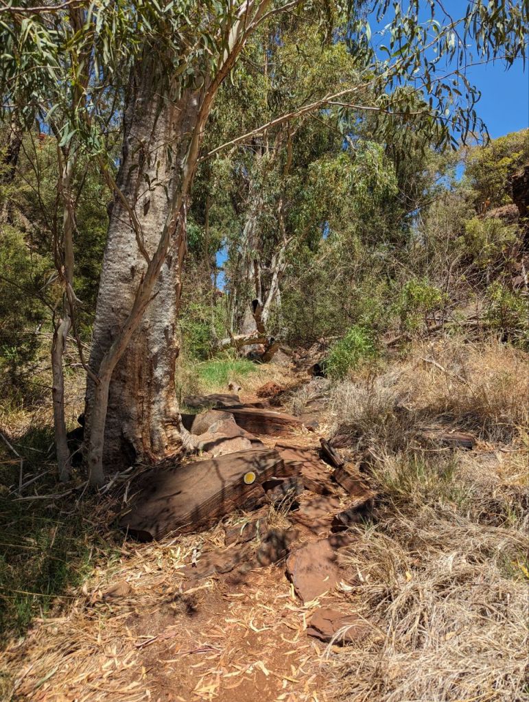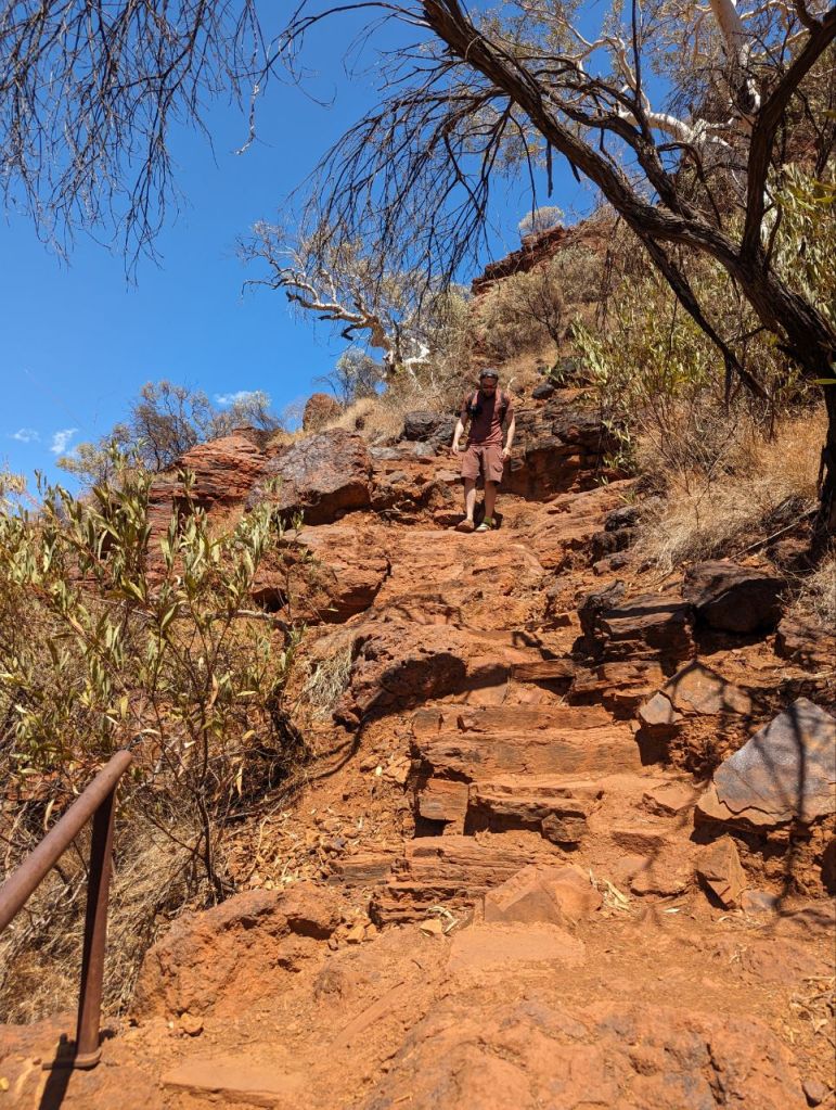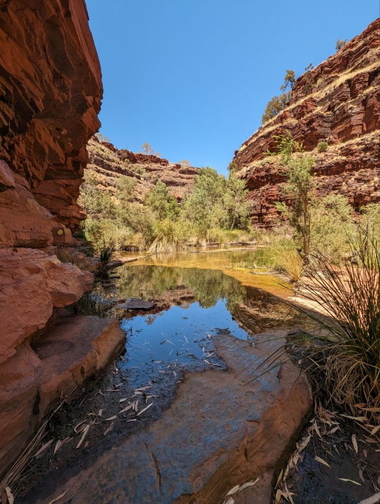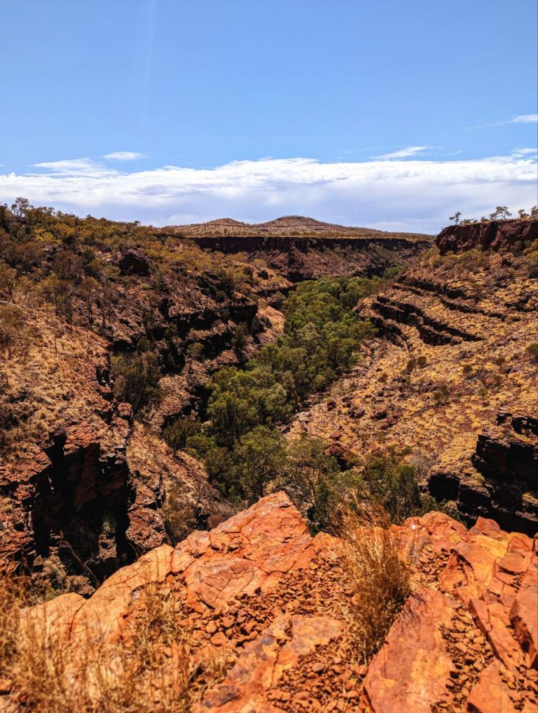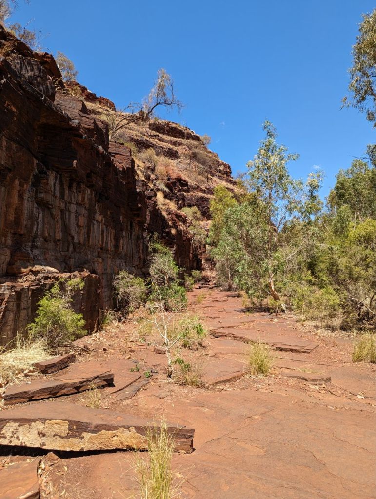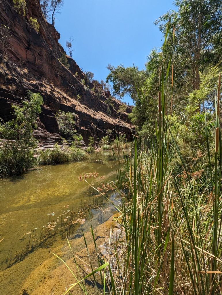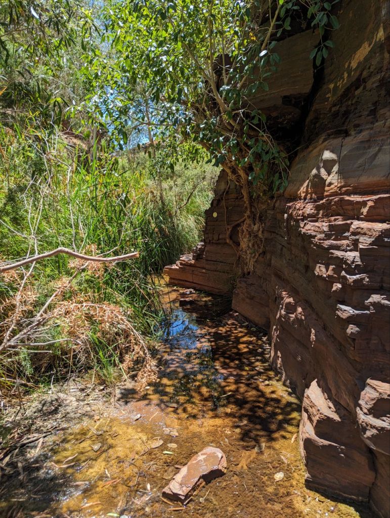Dann geht’s weiter mit dem Klasse 4 Trail Ngirribungunka (ca. 2 km) runter in den Canyon und den Canyon entlang. Hier ist es richtig schön. Es ist grün und riecht nach Sauna (fühlt sich auch bisschen so an 😅). Immer wieder sieht man den Fluss, gelegentlich müssen wir diesen auch überqueren.