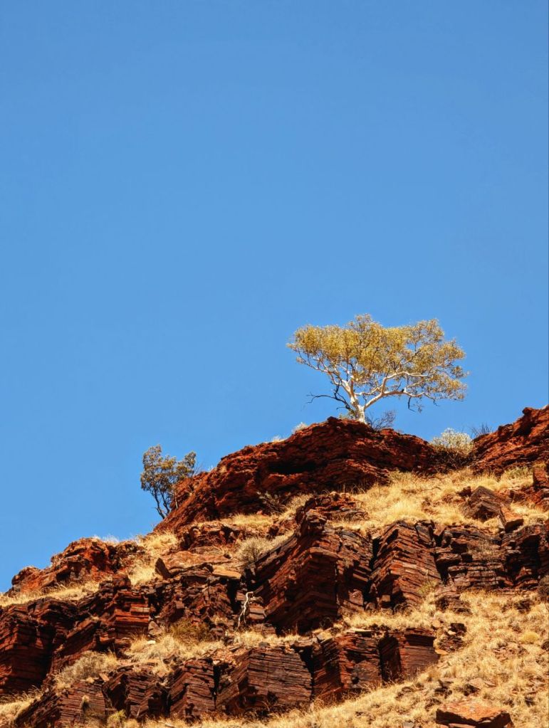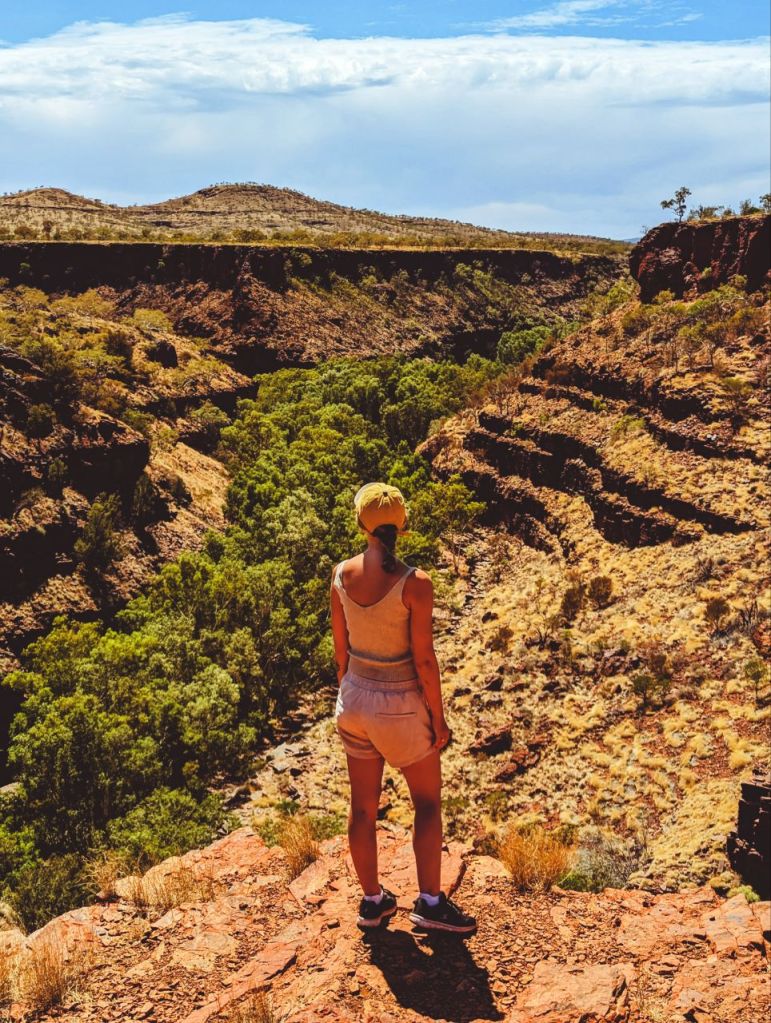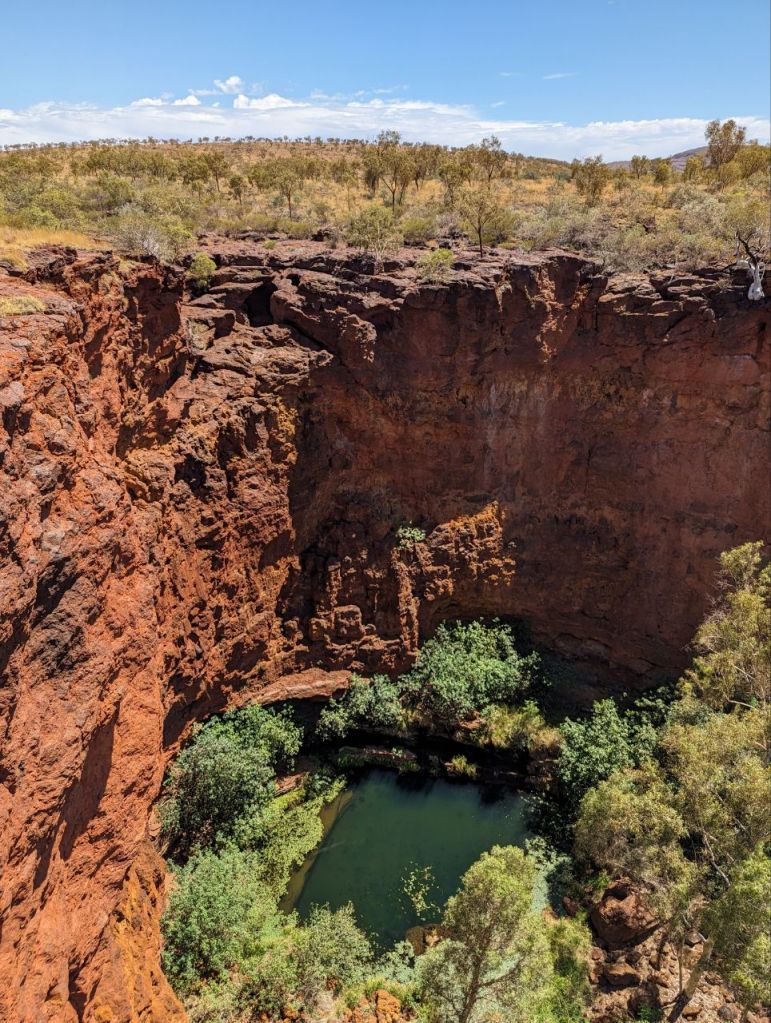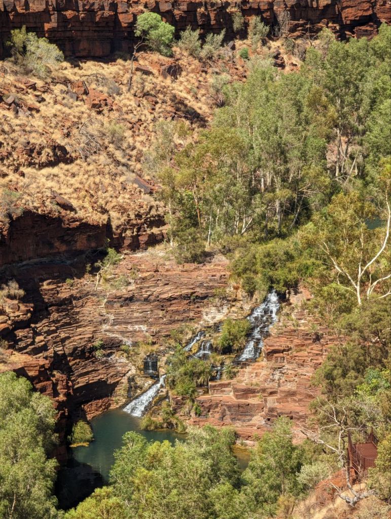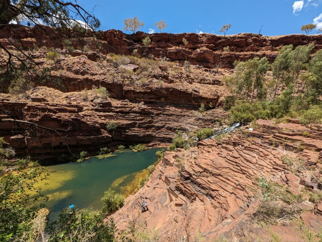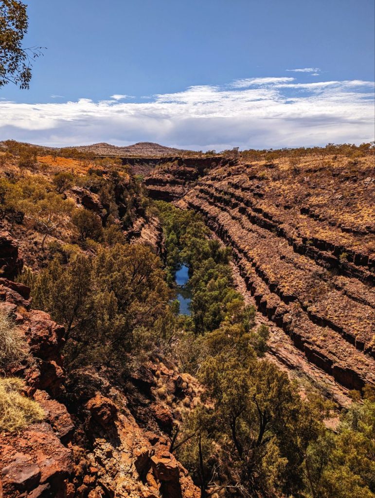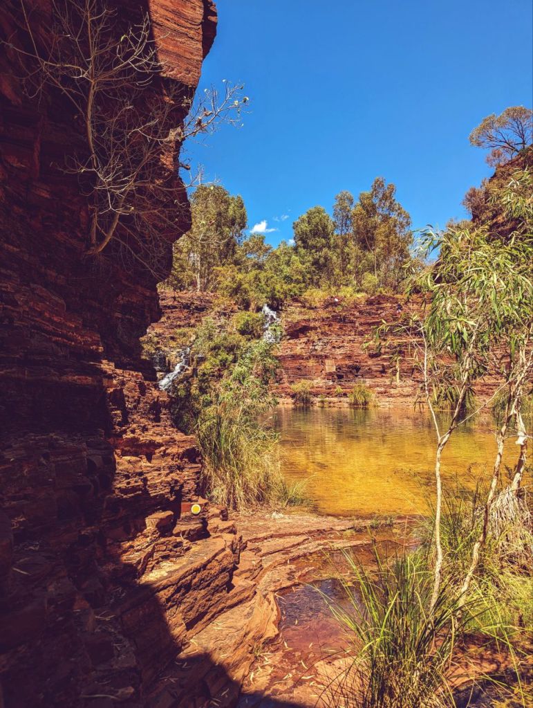 Dann geht’s weiter mit dem Klasse 4 Trail Ngirribungunka (ca. 2 km) runter in den Canyon und den Canyon entlang. Hier ist es richtig schön. Es ist grün und riecht nach Sauna (fühlt sich auch bisschen so an 😅). Immer wieder sieht man den Fluss, gelegentlich müssen wir diesen auch überqueren.