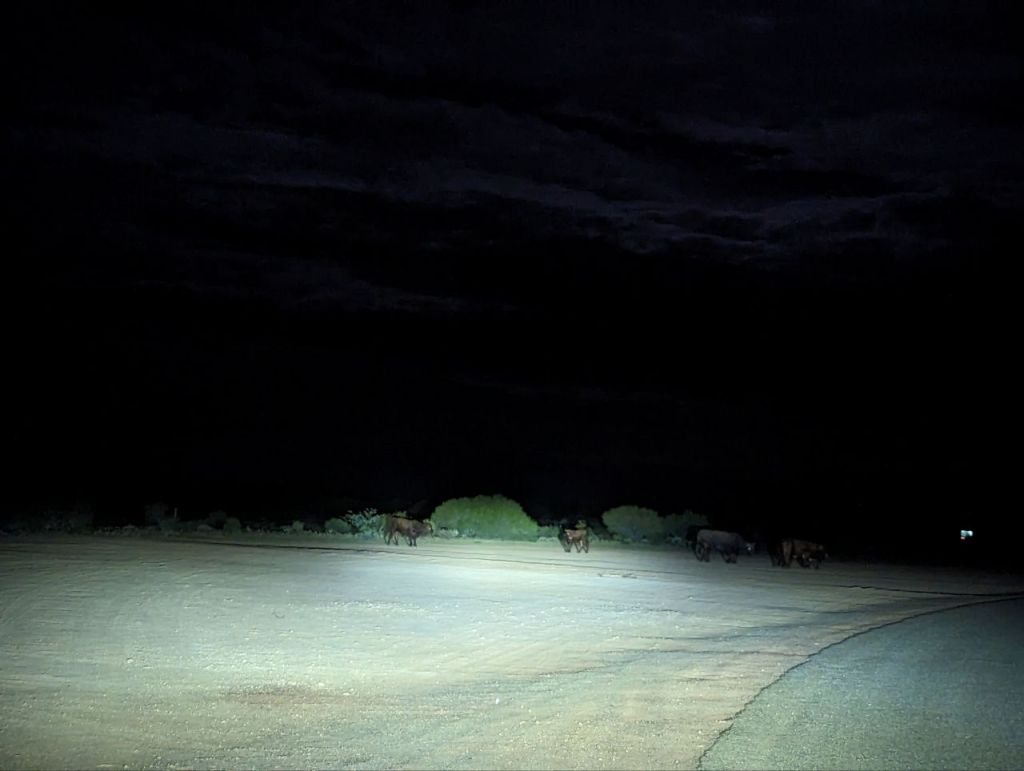 Es geht weiter bis zu unserer kostenlosen Rest Area. Eine Herde Kühe steht hier rum. Nachts kühlt es ab.