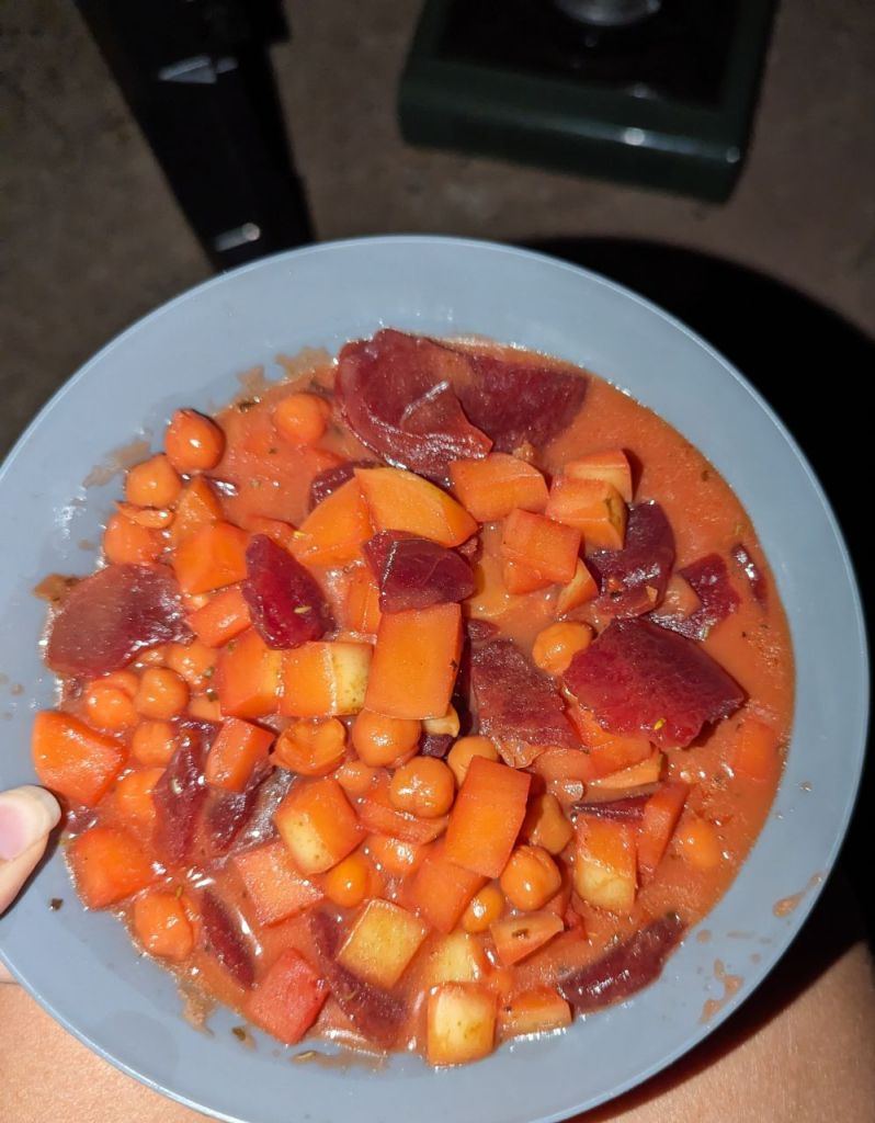Zu Essen gibt’s Eintopf aus Kartoffeln, Rote Beete, Kichererbsen und Kokosmilch. Die Nacht ist angenehm kühl.