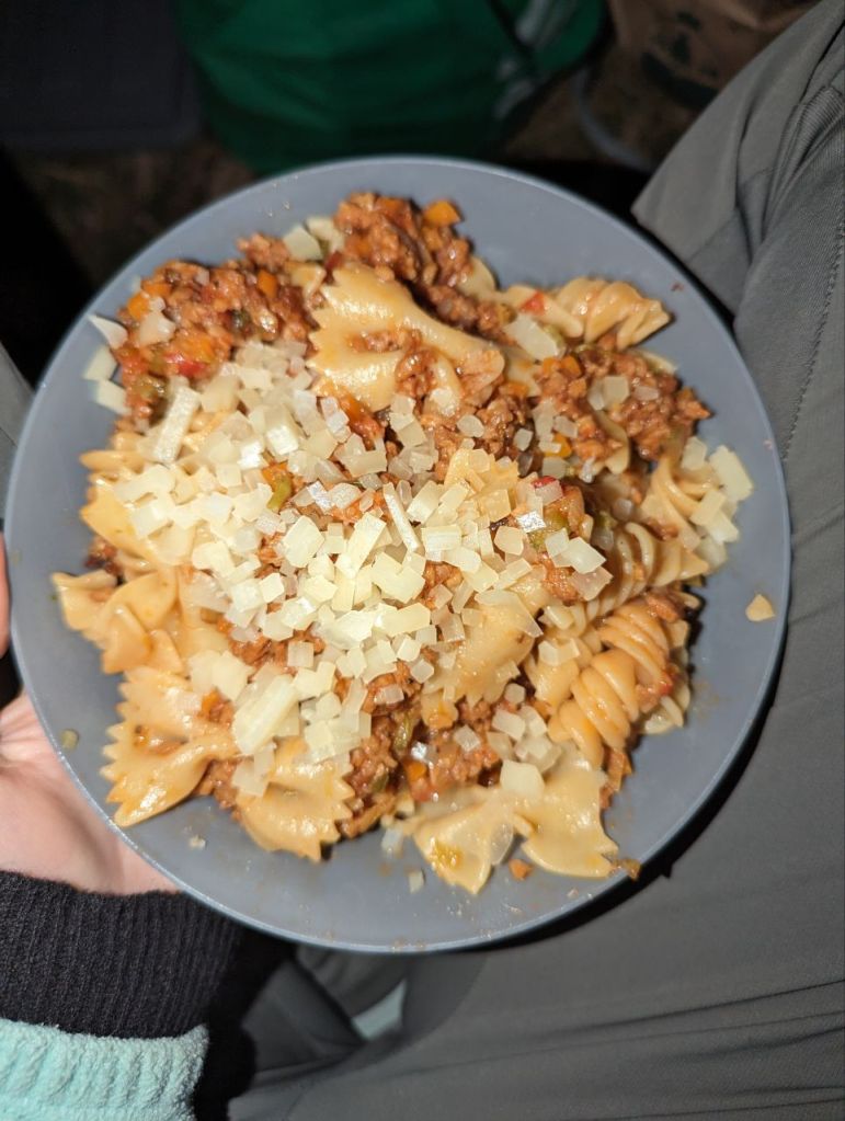 Zu Essen gibt es Nudeln mit Bolognese – lecker.