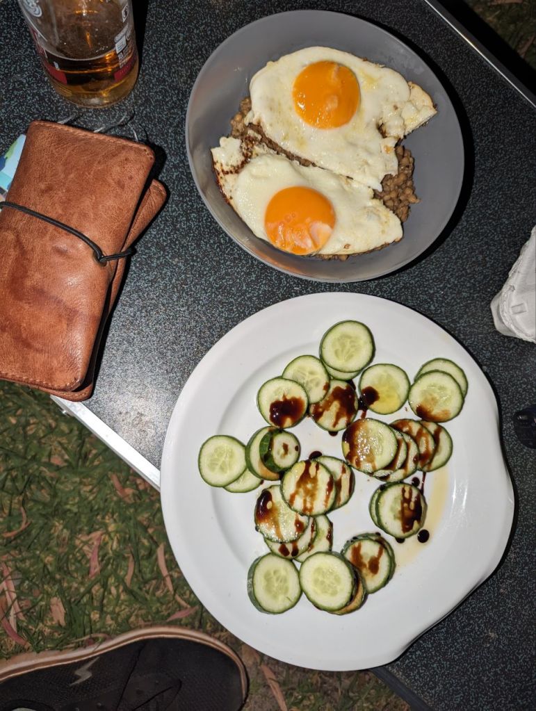 Anschließend gehen wir einkaufen. Zu Essen gibt’s Linsen mit Spiegelei, Gurken und Brötchen.