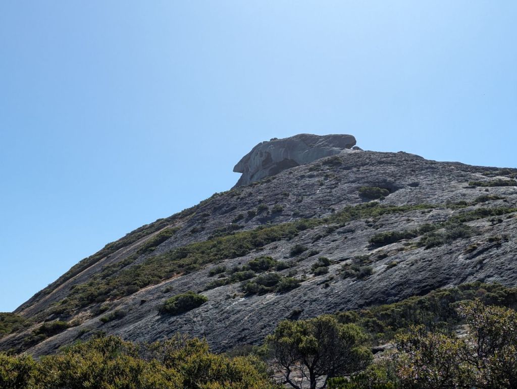 Dann geht’s weiter zum Frenchman Peak. Wir laufen den steilen Berg hinauf. Fast ganz oben ist ein riesiger Felsspalt.